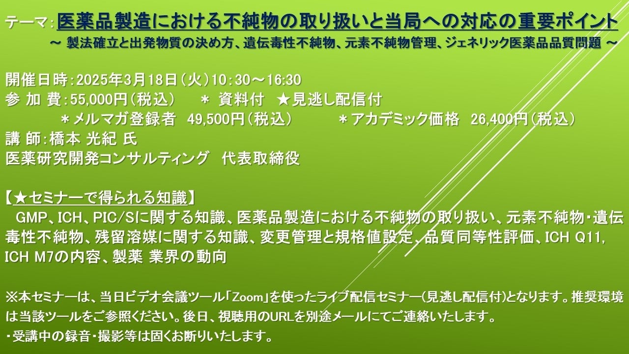 先端技術情報や市場情報を提供している(株)シーエムシー・リサーチ(千代田区神田錦町: https://cmcre.com/ )では、 各種材料・化学品などの市場動向・技術動向のセミナーや書籍発行を行っておりますが、 このたび「医薬品製造における不純物の取り扱いと当局への対応の重要ポイント~ 製法確立と出発物質の決め方、遺伝毒性不純物、元素不純物管理、ジェネリック医薬品品質問題 ~」と題するセミナーを、 講師に橋本 光紀 氏 (医薬研究開発コンサルティング 代表取締役)をお迎えし、2025年3月18日(火)10:30より、 ZOOMを利用したライブ配信で開催いたします。 受講料は、 一般:55,000円(税込)、 弊社メルマガ会員:49,500円(税込)、 アカデミック価格は26,400円(税込)となっております(資料付)。