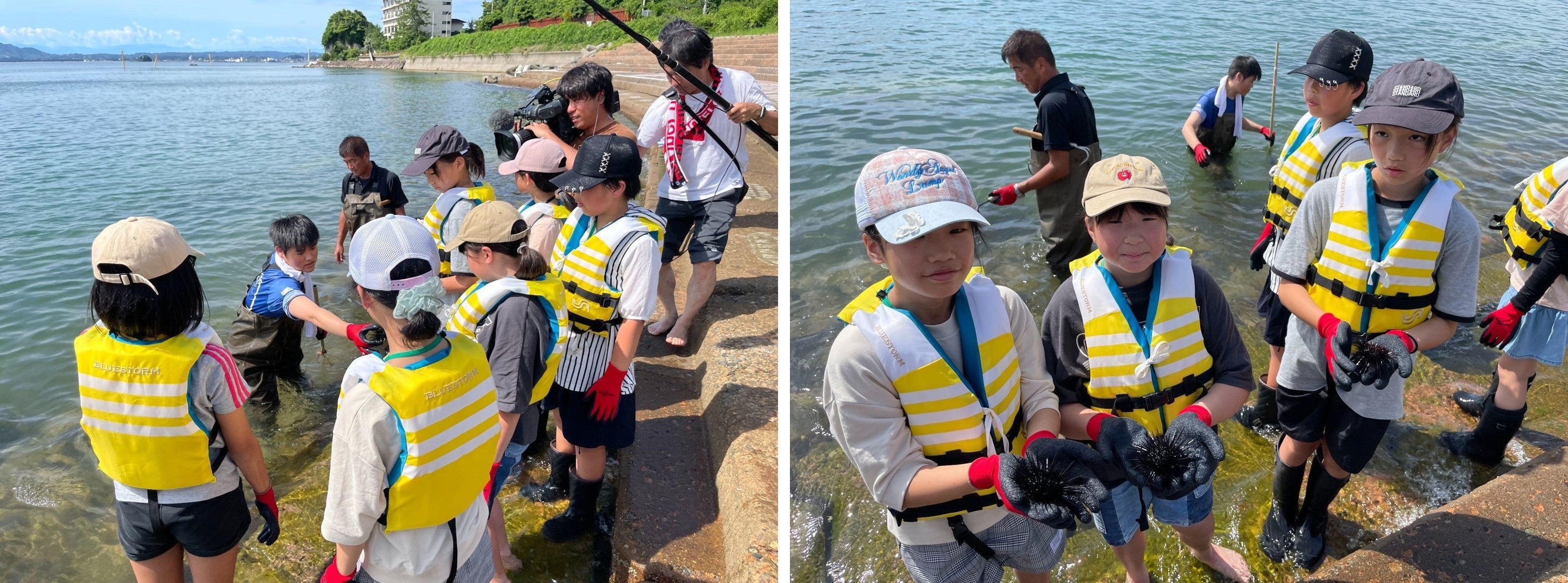 最終日の朝は氷見市の海岸へ。近年、増えすぎたムラサキウニが海藻を食べ尽くしてしまう「磯焼け」が県内でも問題になっています。氷見高校海洋科学科の生徒たちはこのウニを駆除する活動を行っており、その様子を見学しながらお手伝いしました。また、高校生は捕獲したウニを廃棄野菜で育て、商品化することを目指しているそうです。富山県栽培漁業センターの実習室で行っている養殖の様子を見学し、活動についての講義も受けました。「この活動が広まってウニに価値がつくようになれば、磯焼け問題の解決にもつながる」と同校の中木先生。身近な海の問題にふれると同時に、年の近い高校生の活動を知ることで、自分たちにできることは何かを考えるきっかけになりました。