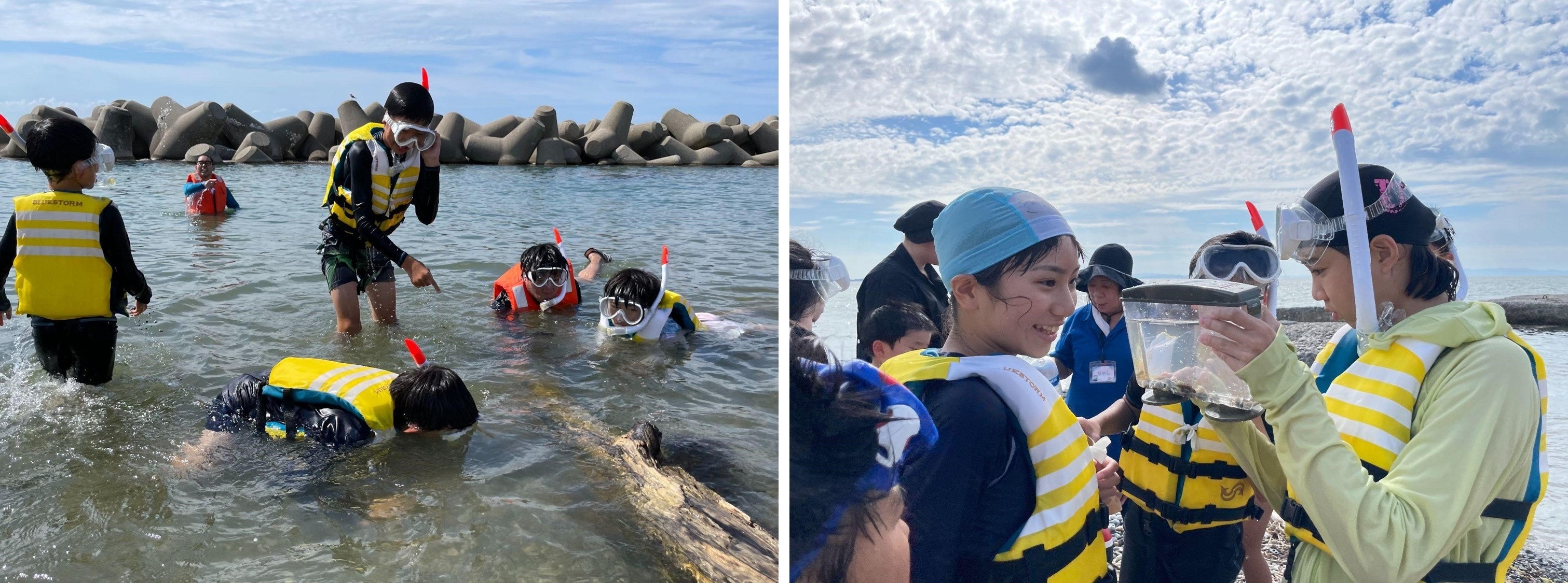 クルージングで船の上から見た富山湾。実際に潜って、どんな生き物がいるかを調査しました。まずは、海で安全に楽しく遊ぶための注意点やライフジャケットの着用方法について、富山県ライフセービング協会の宮田さんにレクチャーしていただきました。そして、ダイビングショップ海遊の木村さんによる指導のもとシュノーケリングを体験! 最初はなかなか生き物を見つけられず苦戦していた子どもたちですが、岩場や流木の下を中心に探すと次々に発見。コケギンポ、ヒメハゼ、メジナの幼魚など、1時間で数種類の魚を見つけることができました。子どもたちは海で遊ぶ楽しさを味わうと同時に、富山湾の豊かさを肌で感じた様子でした。