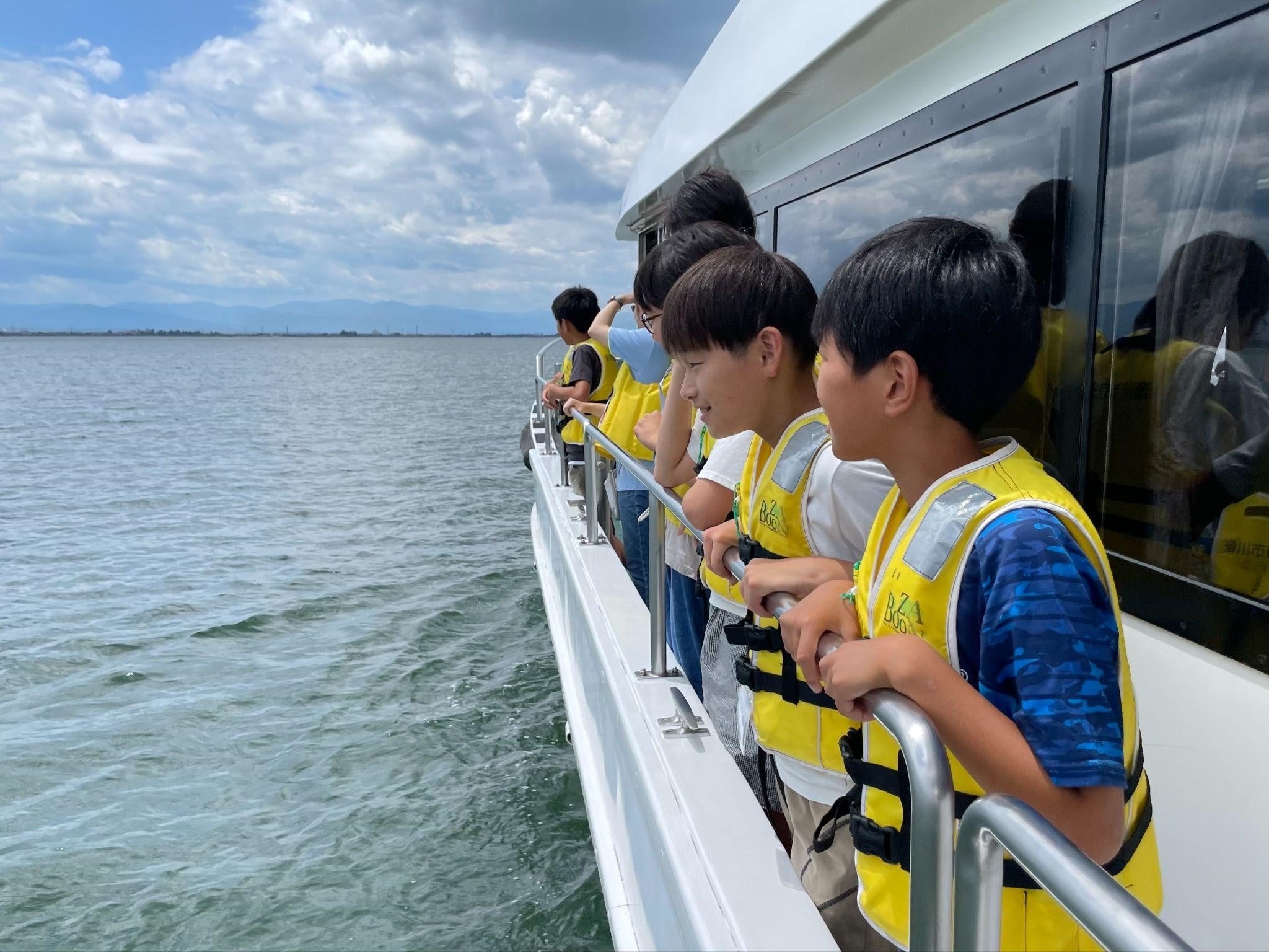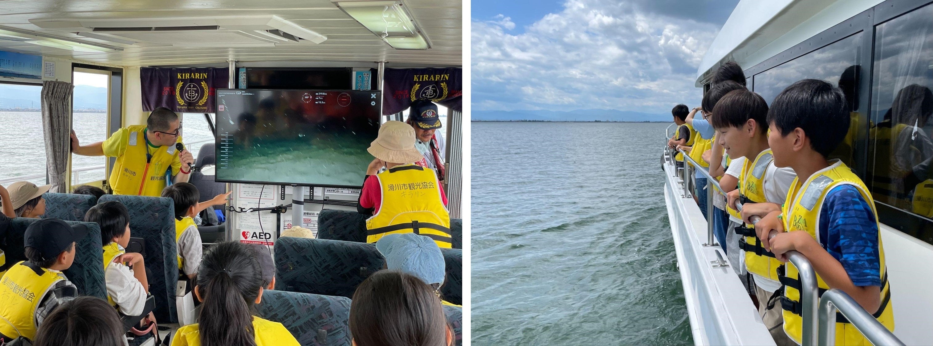 最初に向かったのは、ホタルイカの街として知られる滑川市。普段はなかなか見ることができない、富山湾の深海にすむ生き物を水中ドローンで観察します。クルージングを行う観光遊覧船「キラリン」に乗り込み、富山湾の特徴についての学習からスタート。立山連峰から富山湾まで高低差4,000mにもおよぶ唯一無二の地形や、沿岸表層水・対馬暖流系水・日本海固有水の3層で構成されていること、日本海に分布する約800種のうち約500種の魚が生息していることなど、子どもたちは学習ノートにメモをしながら知識を身につけました。