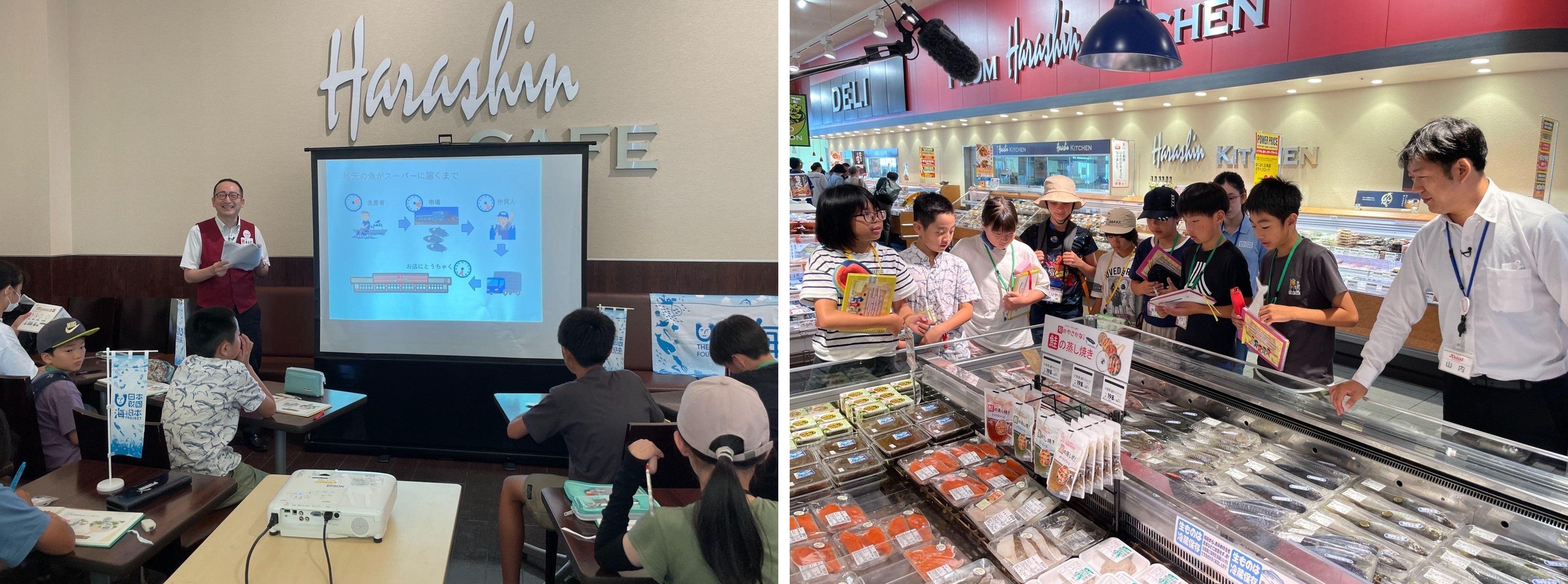 続いて訪れたのは、地域密着型のスーパーマーケット・原信の魚津店。地元の魚が売り場に並ぶまでの流れを学習します。富山県は漁場が近いことから「水揚げされてから市場、仲買人を経て、お店に到着するまでの時間が短い」と前田店長。実際に売り場を見学すると、地元で今朝とれた魚が午前10時台には並んでおり、子どもたちは「さっき見た魚だ!」と感激していました。原信では、魚をお刺身やお惣菜などにすることで食べやすくしているほか、食品ロスを減らすための取り組みにも力を入れているそうです。みんな前田店長の話に終始興味津々で、「よく売れる魚は?」「以前に比べて仕入れが難しくなっている魚は?」「売れ残った魚はどうしているの?」と、質問も止まりませんでした。