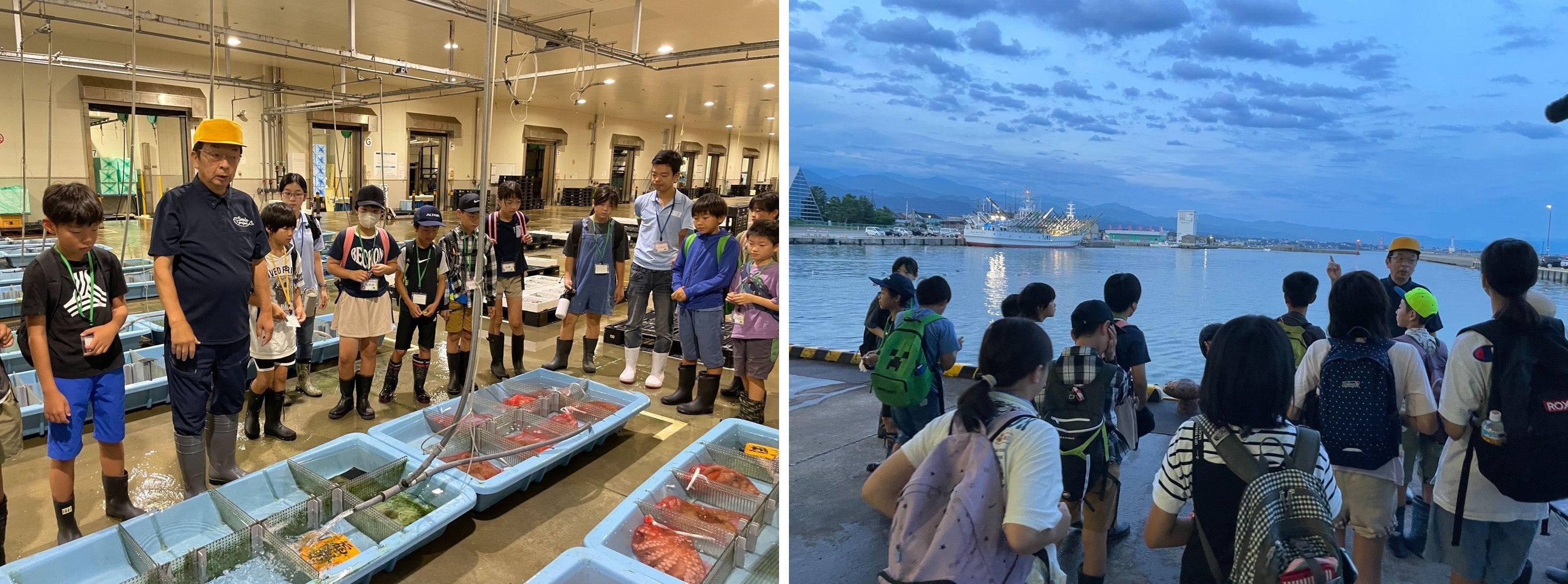 2日目の早朝、3時に起床して向かったのは魚津漁港。魚津漁業協同組合の浜積組合長に、漁港の中を案内していただきました。この日はいつもと比べて水揚げ量が少なかったそうですが、競り場にはウマヅラハギ、タチウオ、アマダイ、ケンサキイカ、岩牡蠣など、多種多様な魚が並んでいました。浜積組合長から「なぜ魚に神経締めをするの?」「札やタグの意味は?」などと問題を出されると、みんなで一生懸命考えながら答えていました。また、海水温の上昇などの要因から、とれる魚の種類や時期が変わってきていることも教えていただきました。最後に、朝5時から始まる競りを見学。前日に入札の仕組みについて予習していた子どもたちですが、生で見る競りの活気に圧倒されていました。