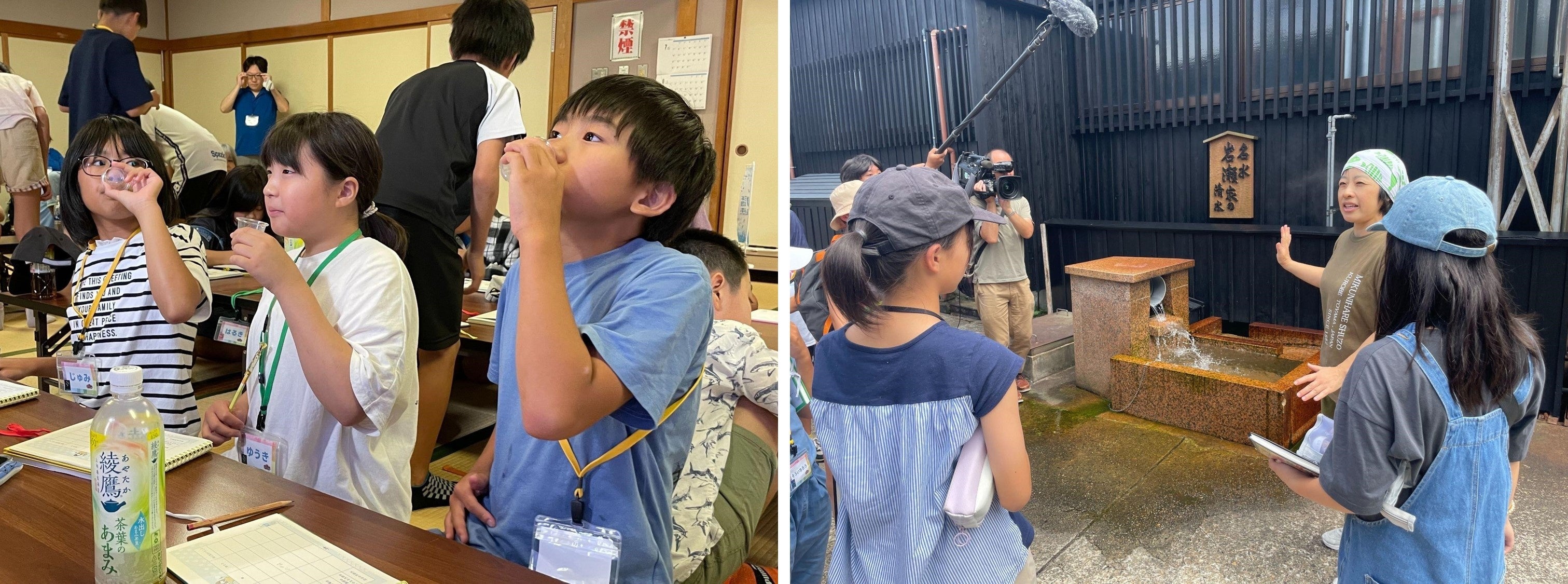 富山の魚の新鮮さを体感した後は、すしを構成する水・米のヒミツにも迫ります。まずは「水」。地質学者の巽さんに、富山の水がおいしい理由を解説していただきました。軟水から硬水まで6種類の水を飲み比べて、成分によって味わいや口当たりが異なることを知った子どもたち。富山の水は「飲みやすい」「おいしい」といった感想が多く聞かれました。さらに、黒部市生地の清水(湧水)をめぐり、森・川・海のつながりを肌で感じました。