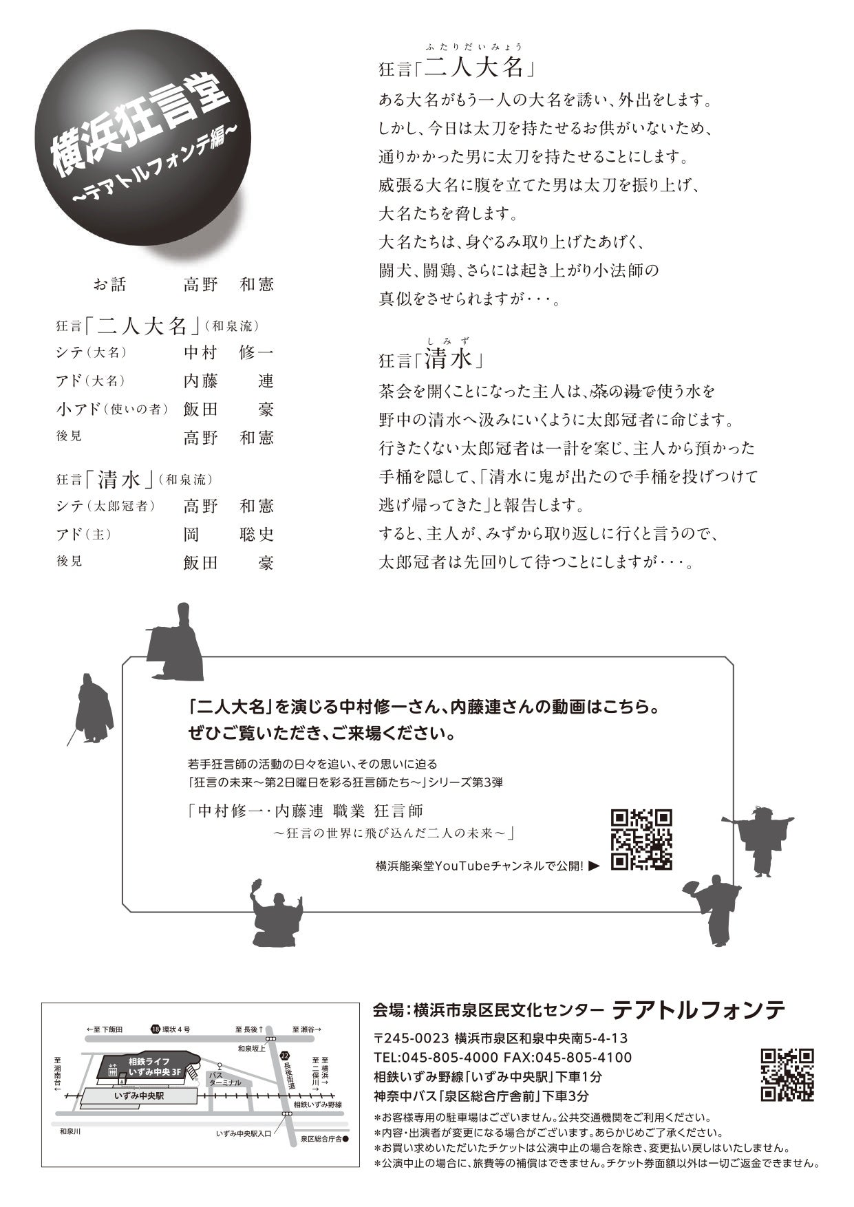 横浜能楽堂は令和8年6月まで休館中のため、今回の横浜狂言堂はテアトルフォンテで開催します。