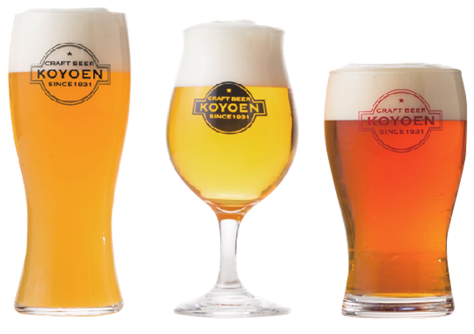 ビールは3種類の浩養園クラフトビール「ヴァイツェン」(画像左)・「ゴールデンエール」(画像中央)・「インディア・ペールラガー」(画像右)のほか、「サッポロ生ビール黒ラベル」や「ヱビスビール」など全8種類からお楽しみいただけます。