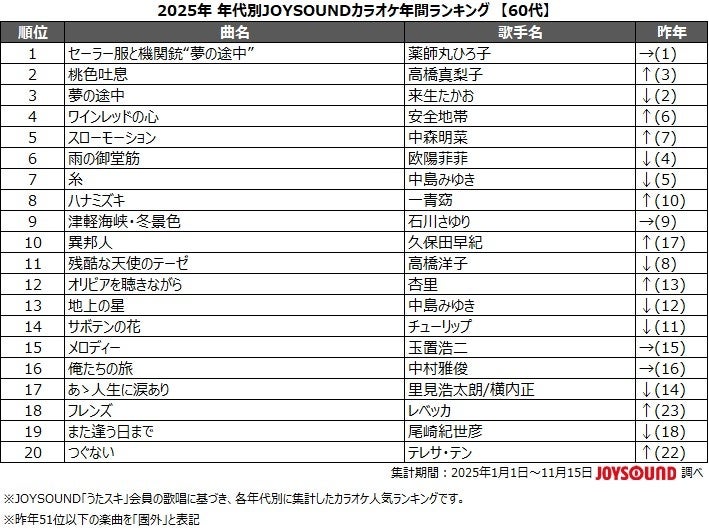 今も色褪せることがない青春時代を彩った往年の名曲を愛する60代。50代と同様、薬師丸ひろ子「セーラー服と機関銃“夢の途中”」がトップに!多少の順位変動は見られるものの、高橋真梨子の「桃色吐息」や来生たかおの「夢の途中」など、長年愛され続けてきた名曲が強さをみせています。