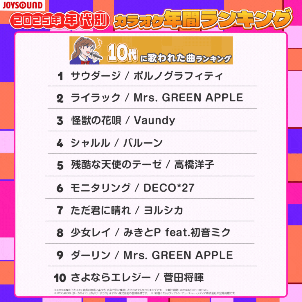 JOYSOUNDが、カラオケ年間ランキングの世代ギャップを徹底解剖!20~40代はMrs. GREEN APPLE「ライラック」がトップ、10代はなんと25年前の名曲が1位に。