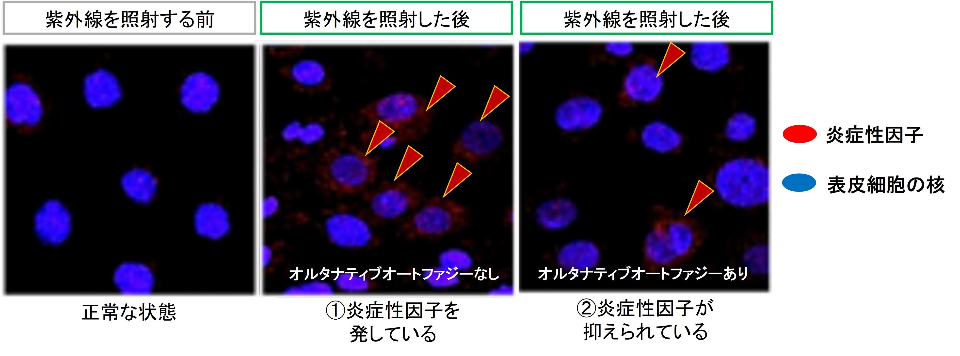 はじめに、表皮細胞に紫外線(UVB)を照射すると、表皮細胞内のミトコンドリアが損傷することが分かりました。また紫外線により損傷したミトコンドリアの周辺では、炎症を指令するたんぱく質集団であるインフラマソームが活性化し、炎症性因子を発していることを確認しました(図2-①)。次に”オルタナティブオートファジー”を活性化させると、炎症性因子が抑えられることが分かりました(図2-②)。”オルタナティブオートファジー”が働くことで、損傷したミトコンドリアが分解され、それに伴い細胞の炎症も抑えられたと考えられます。