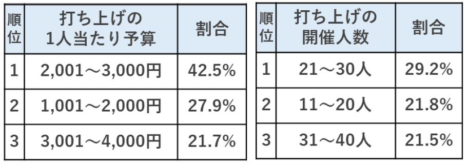 予算は「2,001~3,000円」の幅が1位、規模は「21~30人」が最多でクラス規模の開催が主流