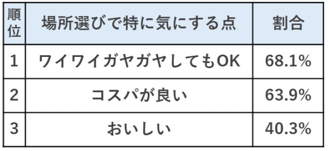 「打ち上げでよく利用する場所」を聞くと、1位「食べ放題の飲食店」、2位「カラオケ」、3位「ファミレス」の結果に。さらに「食べ放題」の中でもどんなジャンルによく行くのかを聞くと、1位「焼肉」、2位「しゃぶしゃぶ」、3位「串揚げ」となりました。また、「場所選び」で特に気にしている点は、1位「ワイワイガヤガヤしてもOK」で存分に盛り上がれる場所を選んでいる様子。2位は「コスパが良い」、3位は「おいしい」と続きました。