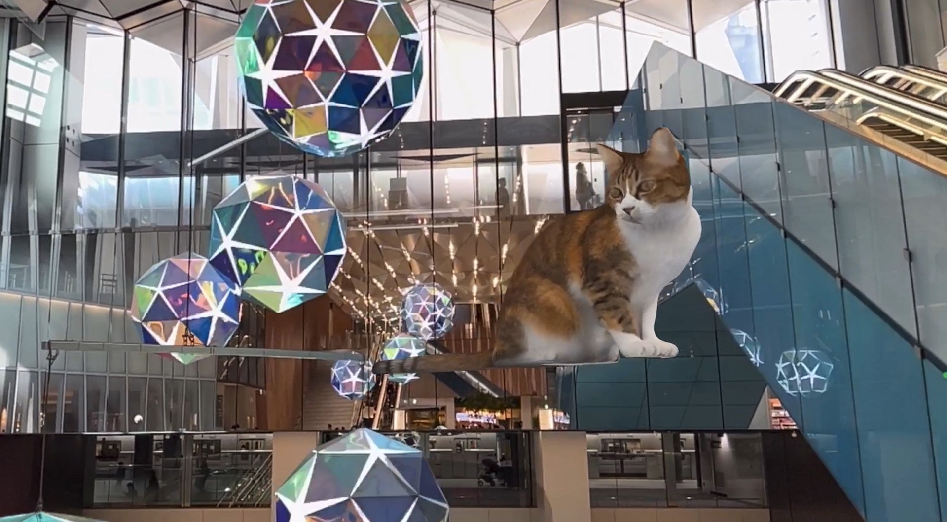 iPadやスマートフォン上にARの猫が出現するAR CAT「NS」の体験会。