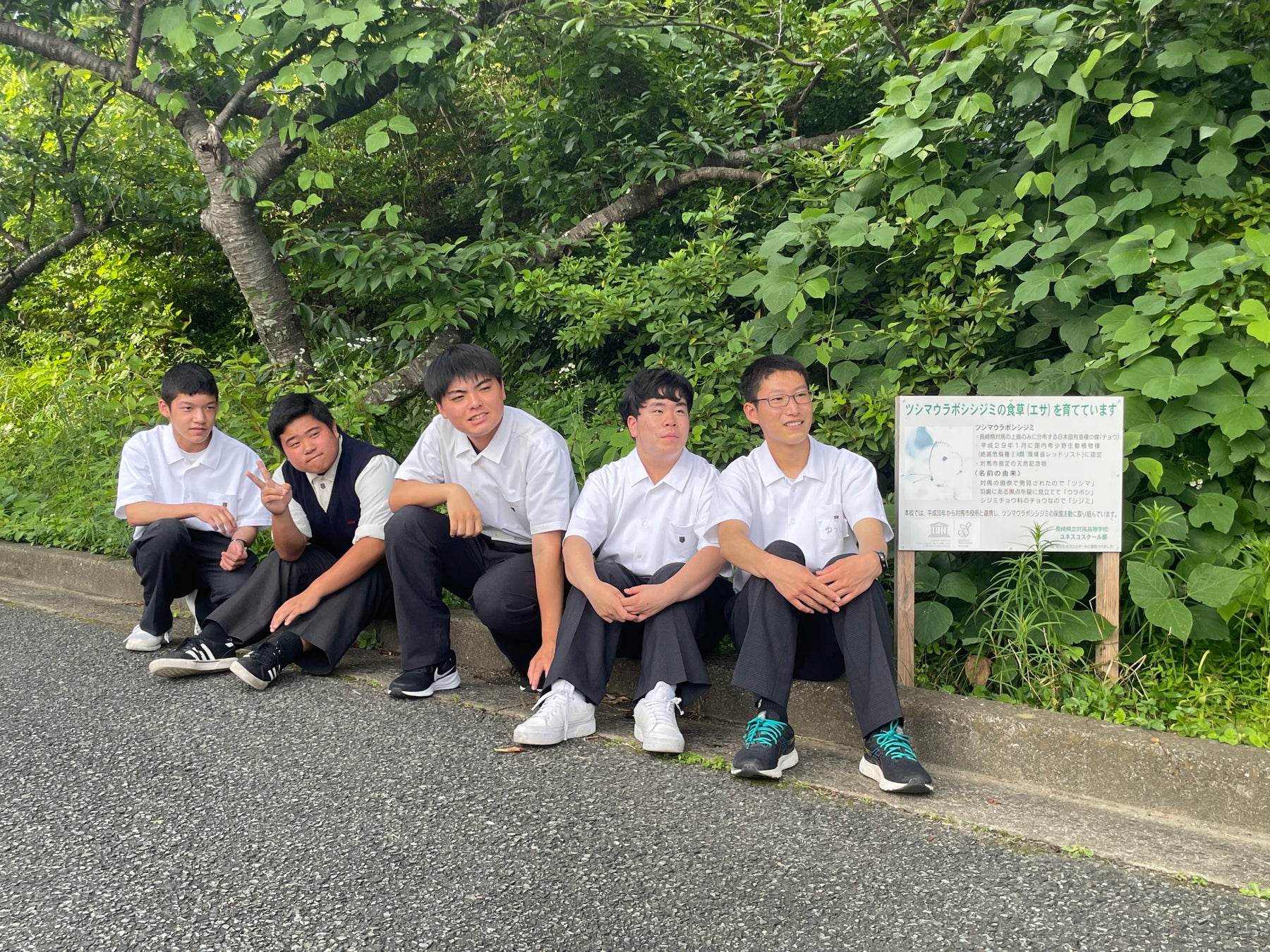 対馬では増えすぎたシカの獣害被害により山の草花が減少し、生態系にも大きな影響をもたらしています。ツシマウラボシシジミ(蝶)もその被害を受ける一つで、ユネスコスクール部は校内で食草である “ケヤブハギ”を栽培し、年に数回保護区へ定植を行っています。