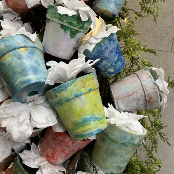 2023年のクリスマスツリーのアイコン「フラワーポット」と2024年のアイコン「蝶」を廃プラスチックでアップサイクルし制作しました。