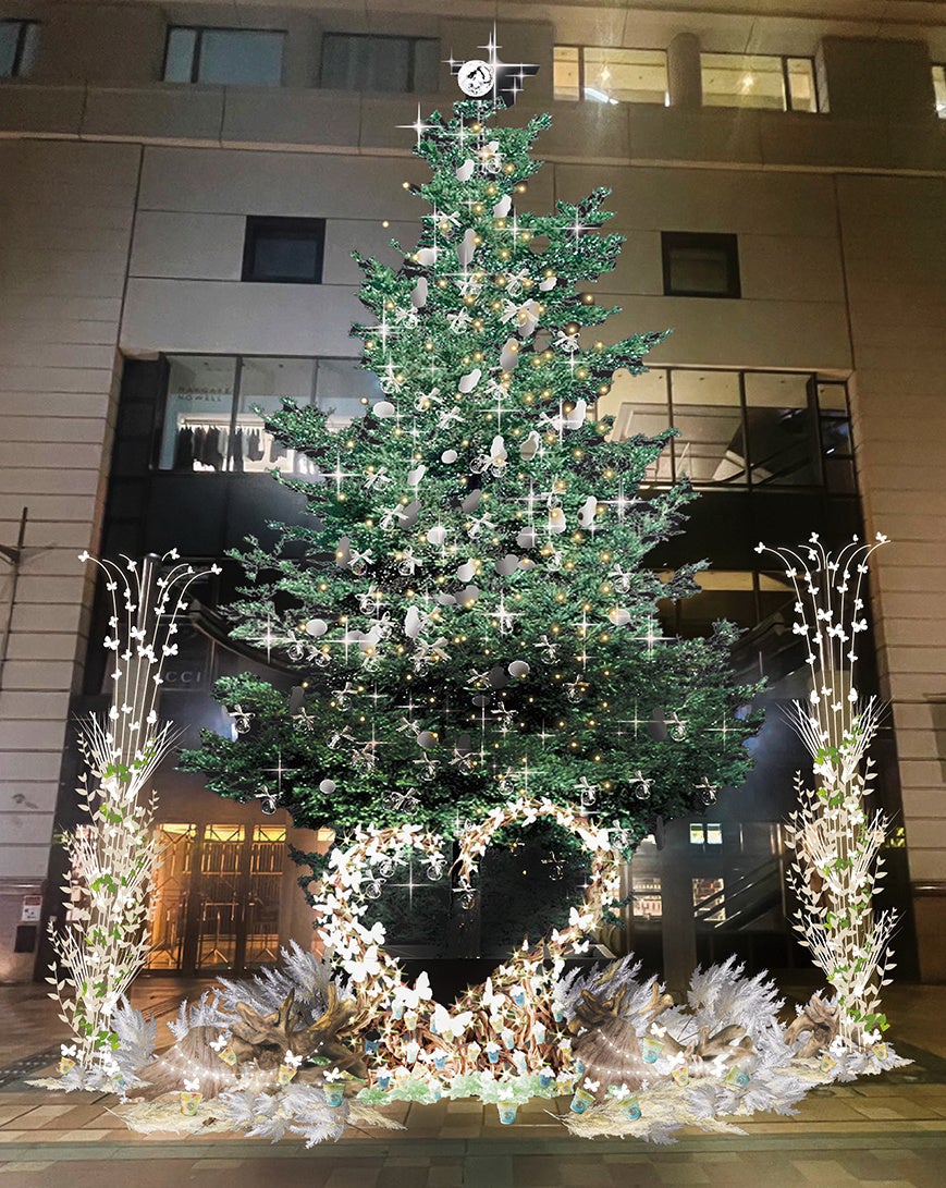 大丸福岡天神店エルガーラ・パサージュ広場の今年のツリーは日本一海洋ごみが流れ着く“対馬”の子供たちと共に、美しい地球と生物の豊かな繋がりが守りたいという想いを込め創り上げました。ツリーを彩るオーナメントは、対馬の海岸に流れ着いたプラスチックごみ(発泡スチロールやペットボトルキャップ)や流木をアップサイクルし制作。美や幸福、“変容”の象徴である蝶をアイコンに、たくさんの生き物が繁栄していく未来に向け、様々な環境問題を回復させるための行動変容“Change”の輪を広げていきます。