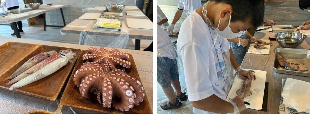 「一本槍イカ」の現状を学んだ子供たちはイカとタコの調理に挑戦!講師は料理研究家の佐藤彰子先生です。まずは2日目のメイン食材である「一本槍イカ」を捌きます。授業で学んだことを思い出しながらイカを捌いていきます。ケンサキイカの特徴として山口さんに教えてもらった、触腕をみんなで観察!活きたイカを触るのはみんな初めて!最初は怖がっていた子供たちも最後は落ち着いて観察をしながら捌き、お家でも作ってあげたい!と捌き方を覚えようと頑張っていました。