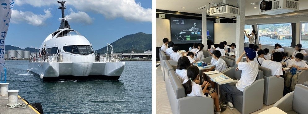 乗船した子供たちは、まず静かな船内にびっくり。先ほど乗ったタコ漁船に比べて音が全然しません。水素だけで動くゼロエミッションモードに切り替えると、更に静かで子供たちも違いをしっかり体感していました。水素燃料を使うことで、温室効果ガスの排出を抑えることが温暖化の抑制に繋がり、海水の温度上昇を食い止める一歩になるということを学びました。
