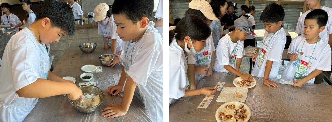 関門海峡タコは佐藤先生が捌きます。捌いたイカとタコを使って地元の老舗蒲鉾店「西門蒲鉾」さんでオリジナル天ぷら蒲鉾を作ります。子供たちが2日間で学んだイカとタコと混ぜ合わせ蒲鉾を開発し、店舗やイベント販売する予定です。開発に向けて販売予定の天ぷら蒲鉾のトッピングのアイディアを出していきます。イカとタコチームに分かれて、各チームどんなものを天ぷら蒲鉾に混ぜたらいいのかアイディア出しをして試作!ふわっと揚がった天ぷら蒲鉾をみんなで試食して、選んだ一つの味に投票していきます!みんなで考えた蒲鉾は絶品!!完成した商品は10月12日のカラフルフェスで子供たちが販売体験を行います!ぜひご賞味ください。