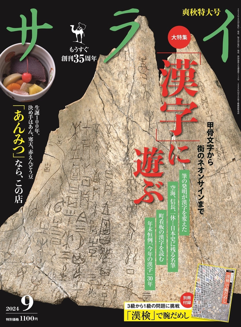 そこで、8月8日発売の『サライ』9月号では、大特集の「 “漢字” に遊ぶ」で、身近にある漢字の魅力を深掘り。甲骨文字からはじまる歴史を辿り、歴史に残る名筆から街のネオンサインまでを取り上げています。