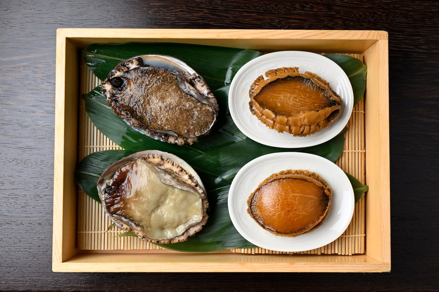 上段は歯ごたえと香りの良いクロアワビ、下段はほのかに甘いメガイアワビ。いずれも生と蒸した(煮た)ものを揃える。産地は千葉の大原。