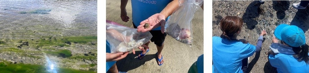 次に向かったのは須美江海水浴場です。ここでは、学習の記念として製作するキーホルダーに必要な貝殻拾いを行いました。貝殻を拾いながら自主的にごみ拾いをする児童たちの姿が見られ、これまでの学びが定着し、「自分事」として行動している様子が伺えました。また、浅瀬にいる生き物の観察を、西田教授、村瀬准教授、さかな芸人ハットリさんらと一緒に行いました。さかな芸人ハットリさんが早速イカの卵を発見! ハットリさんは児童たちに、「イカがここで育っていって大きいおいしいイカになっていくのだけれど、海藻がないとそういう魚も増えないので、このような環境はとても大事です」と話しました。