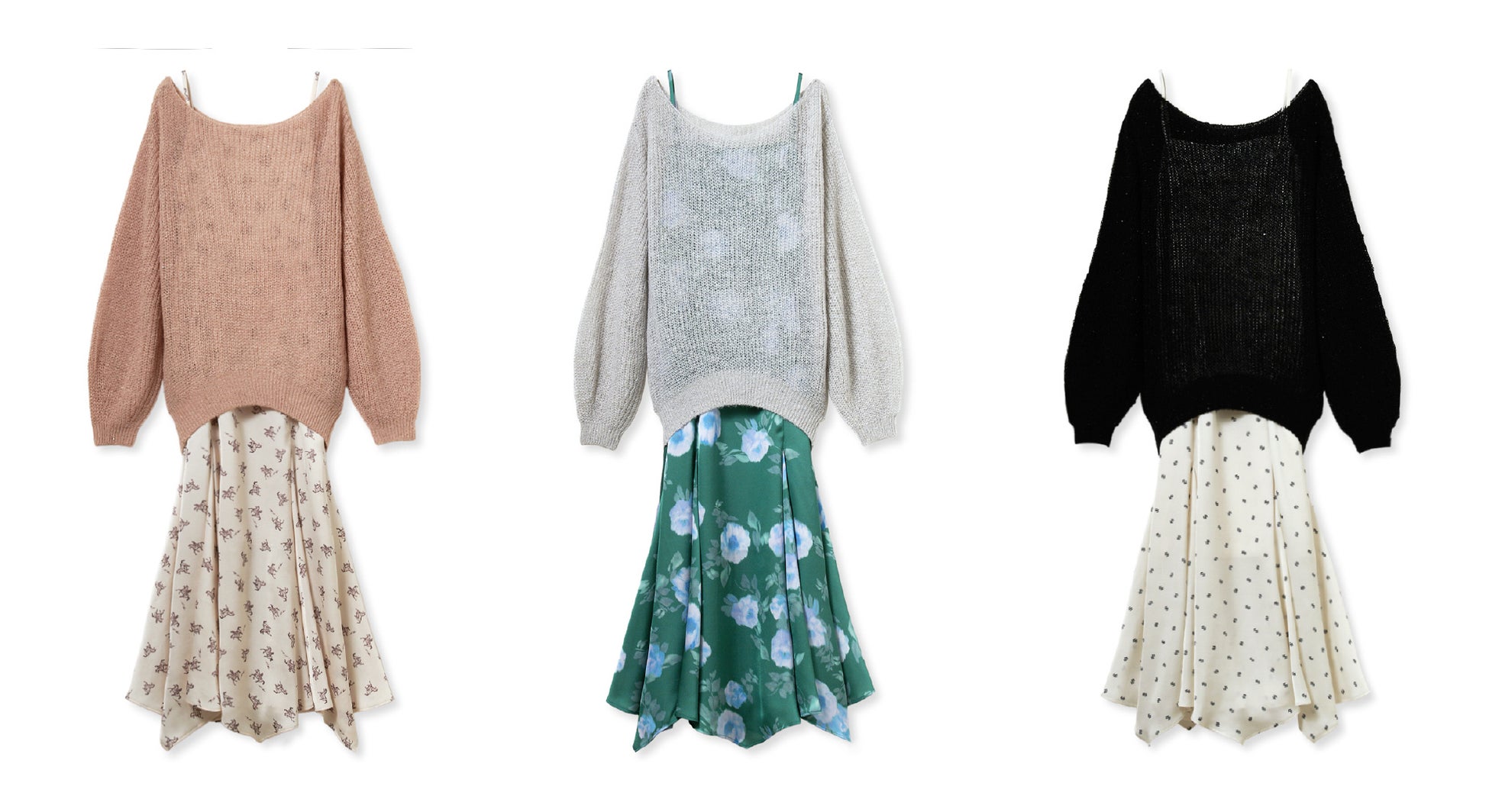 LILY BROWNで過去に人気のあった3柄をプリントしたキャミワンピースに、ラメ感のあるシアーニットトップスをセットにしました。