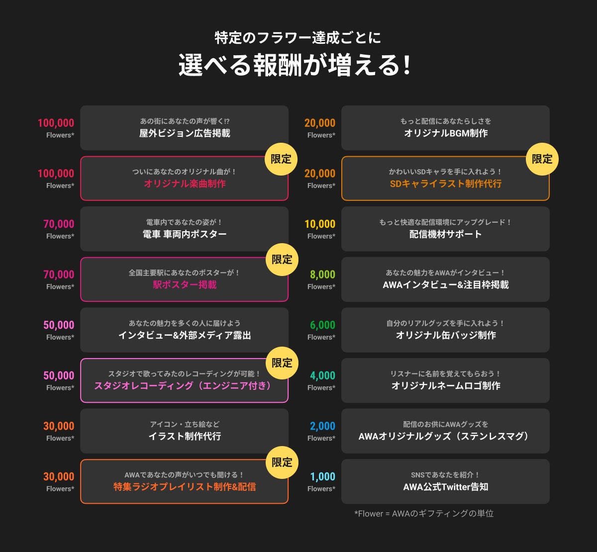 ギフティング還元率の引き上げと「フラワーリワード」を一新したことにより、クリエイターをより支援する環境がさらに整えられました。AWAは5月27日に9周年を迎え、AWA主催のリアルライブの定期開催やクリエイターの特別な瞬間を残す新機能emorieのリリースなど、クリエイターをさらに応援していける企画や機能の開発を積極的に行っています。ぜひ、今後のAWAにご注目ください。