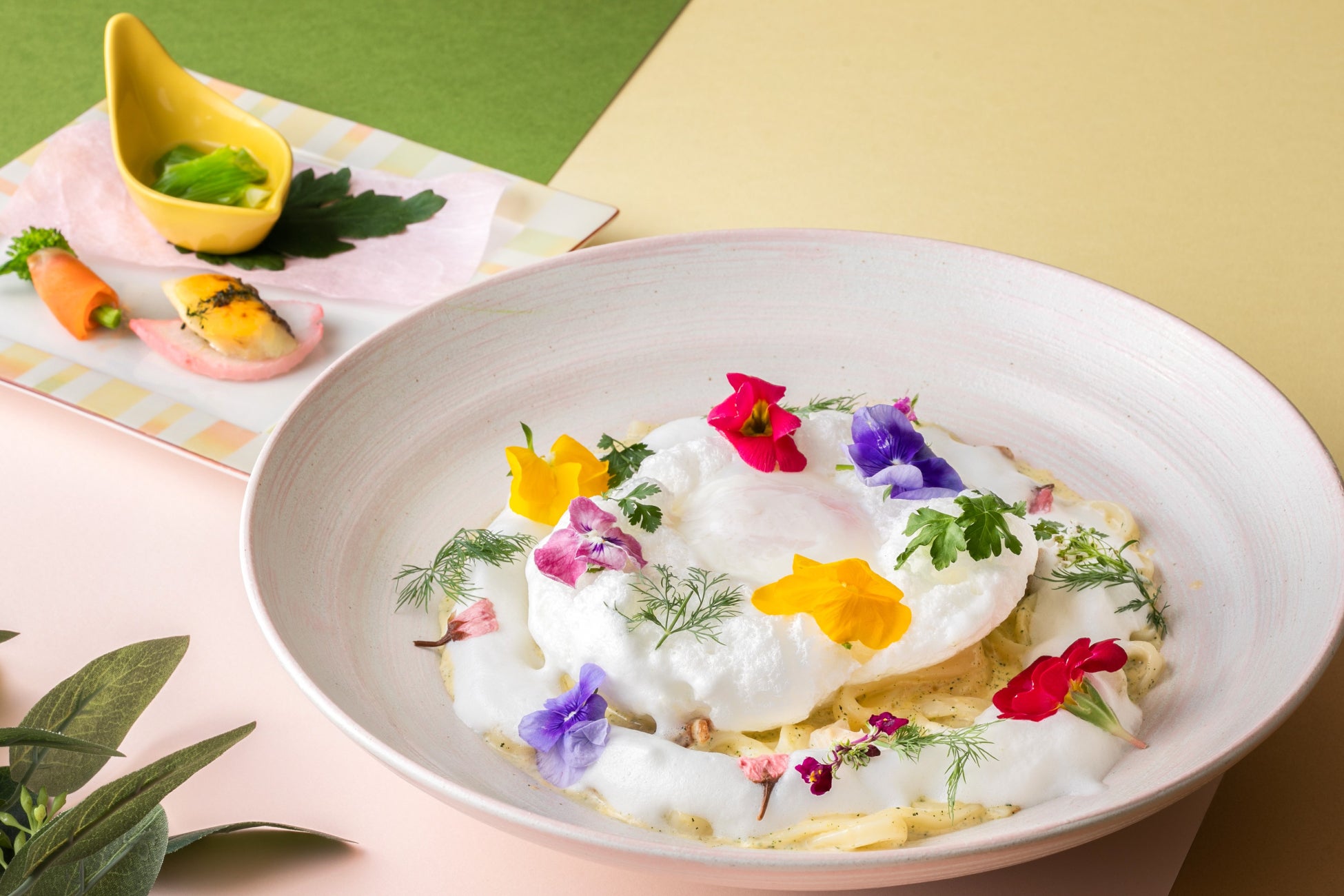 エディブルフラワーなどを散りばめて、春のお花畑を連想させるよう可愛らしく仕上げました。