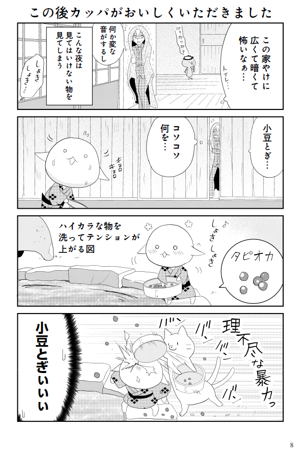 43匹の心優しいカッパ、自分をナメてるものには容赦がない猫又の白玉、そんな白玉にシバかれる不憫な小豆とぎなど。