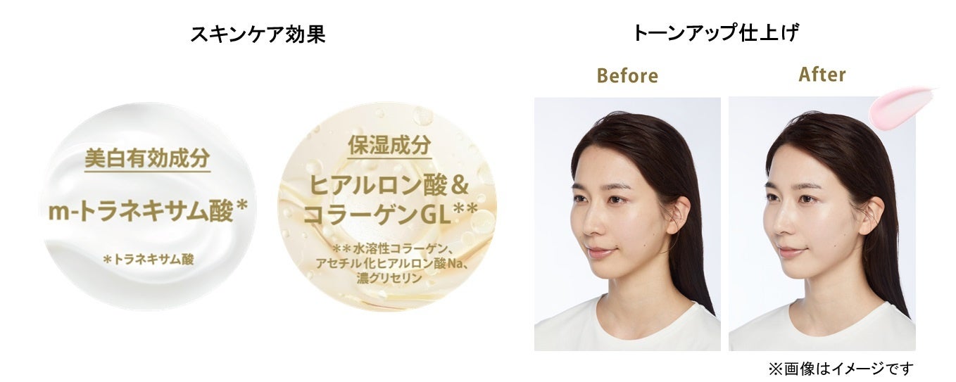 スキンケア効果、トーンアップ仕上げによって、内へも外へも透明感のある肌へ