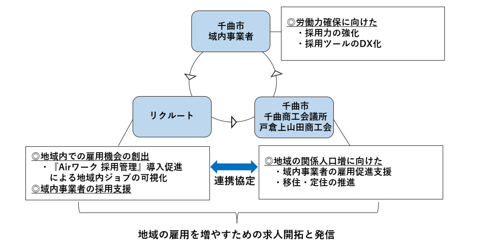 当社は、0円でカンタンに求人募集ができる採用管理サービス『Airワーク 採用管理』の提供を通じて千曲市内の事業者の採用ホームページ作成をサポートし、地域内の仕事の可視化と求人募集情報の発信力の強化に努めます。千曲市、千曲商工会議所、戸倉上山田商工会は、市内の事業者を対象にしたセミナーを開催するとともに、当社と共同で事業者の採用活動を支援します。 セミナーでは、当社と千曲市、千曲商工会議所、戸倉上山田商工会が連携し、採用市場の動向やサービスのご紹介、応募を集めるための求人原稿の作成を実施します。