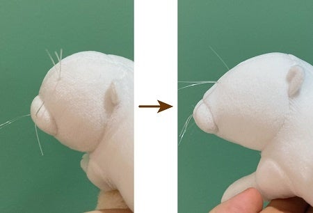 少しムッチリして、ポーズも自然になってきました。ティッシュカバーの生地色も、インテリアになじむように、落ち着いたカラーに変更しました。さらに、本物のカワウソはもう少しムッチリしている子が多いので、再修正します。