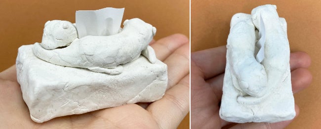 水族館でもよく見られる、カワウソ同士でくっついて寝ている様子を再現しつつ、ティッシュを取り出すときに「ちょっとごめんよ〜」と2匹のカワウソに話しかけたくなるような配置に。しっぽを枕にされているけれど、お互いに全然気にしていなさそうなのがポイントです。