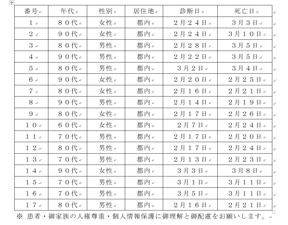 都内で新型コロナウイルスに感染した方が死亡されましたのでお知らせします。