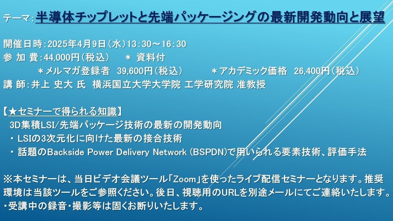 先端技術情報や市場情報を提供している(株)シーエムシー・リサーチ(千代田区神田錦町: https://cmcre.com/ )では、 各種材料・化学品などの市場動向・技術動向のセミナーや書籍発行を行っておりますが、 このたび「半導体チップレットと先端パッケージングの最新開発動向と展望」と題するセミナーを、 講師に井上 史大 氏(横浜国立大学大学院 工学研究院 准教授)をお迎えし、2025年4月9日(水)13:30より、 ZOOMを利用したライブ配信で開催いたします。 受講料は、 一般:44,000円(税込)、 弊社メルマガ会員:39,600円(税込)、 アカデミック価格は26,400円(税込)となっております(資料付)。