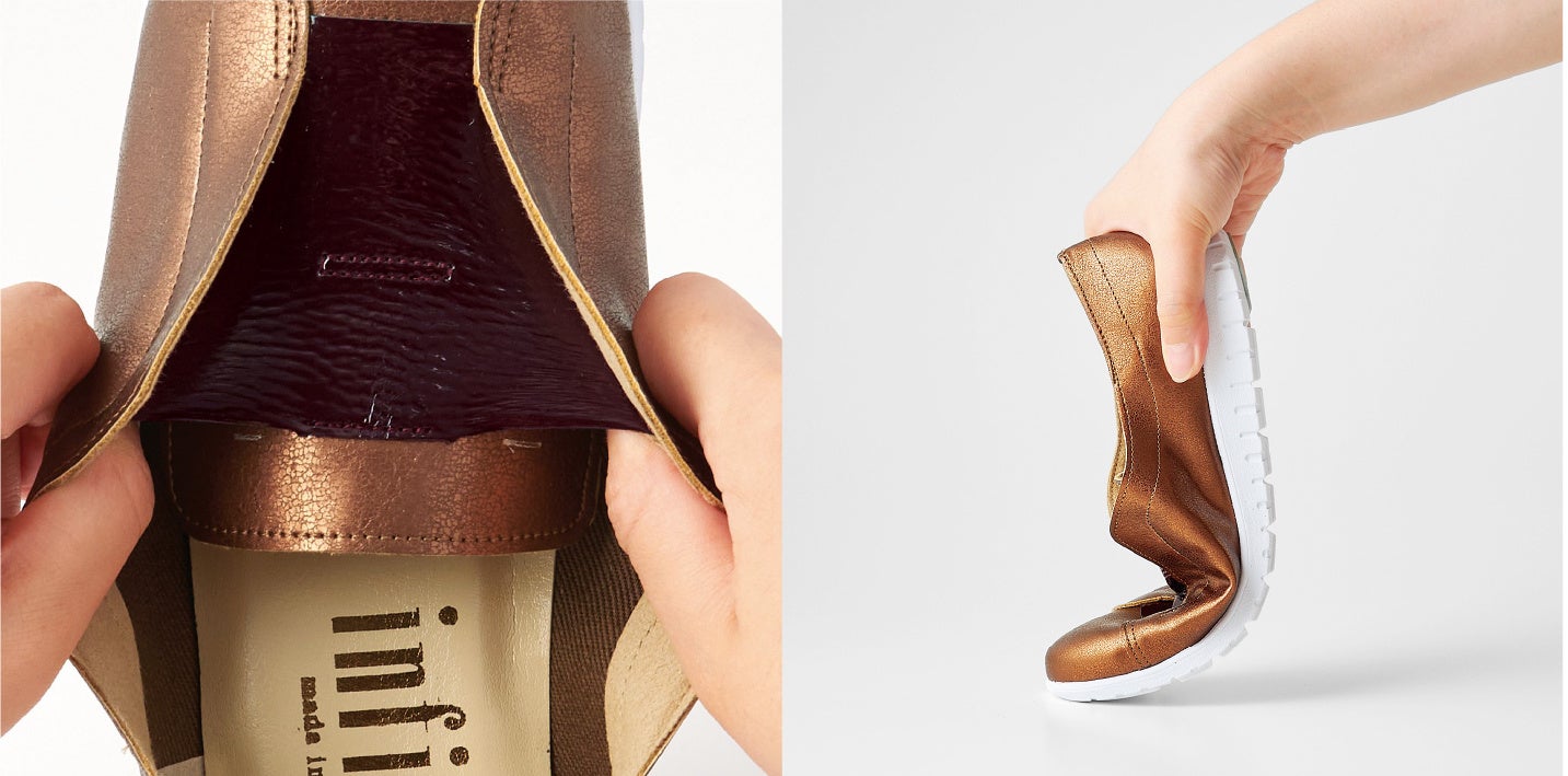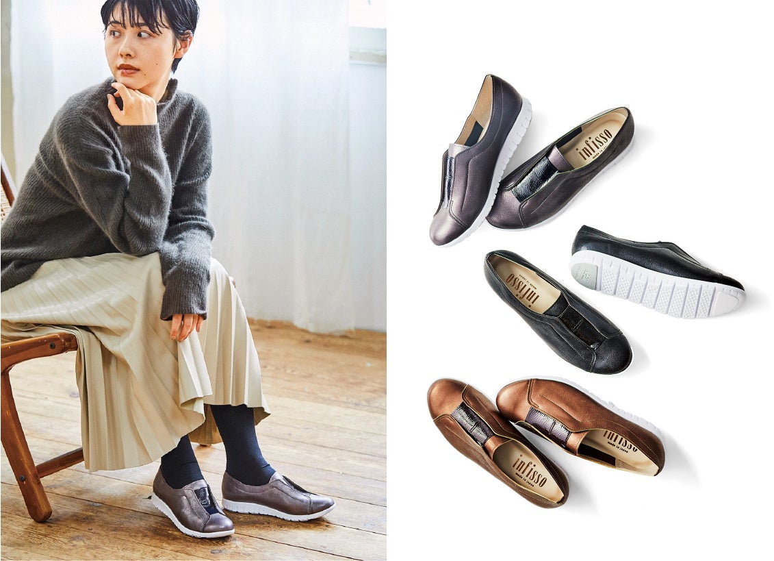 上品なシャイニー素材と、つやつやのエナメル素材のコンビが美しいスリッポンです。屈曲性の高いソールで、着脱も簡単で、スニーカーの履き心地ときちんと感を両立した軽く履ける3色展開のシューズです。