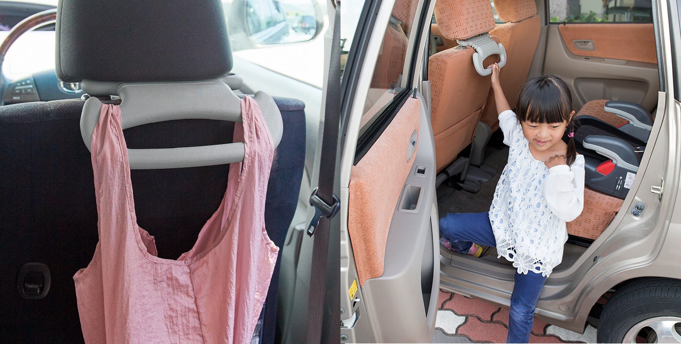 ヘッドレストに取り付けておけば、お子さまからお年寄りまで握れて、安全を確保できる手すりです。ヘッドレストを外して穴に通すだけで設置できます。乗り降りだけでなく、カーブの際にもからだを支える補助として役立ちます。