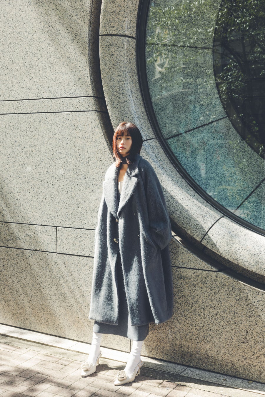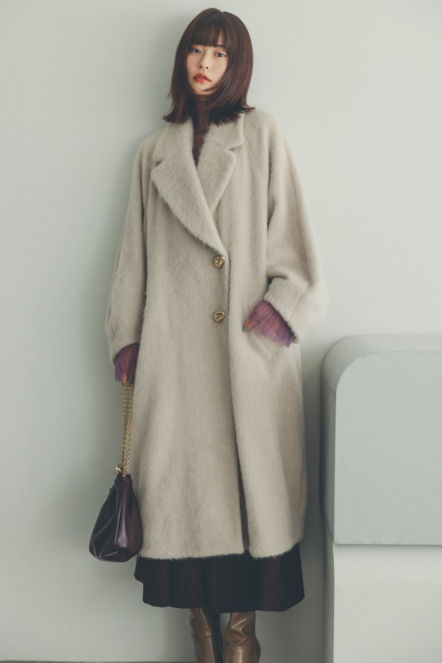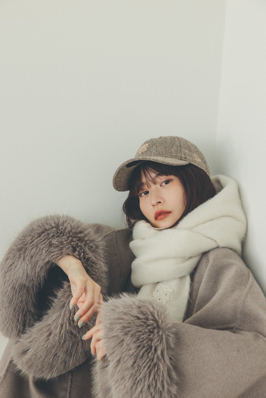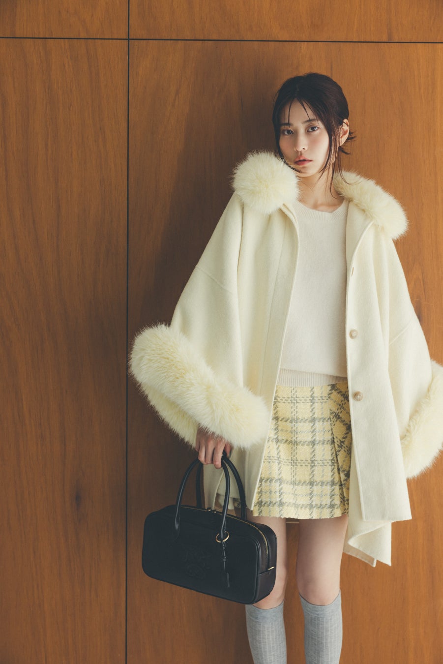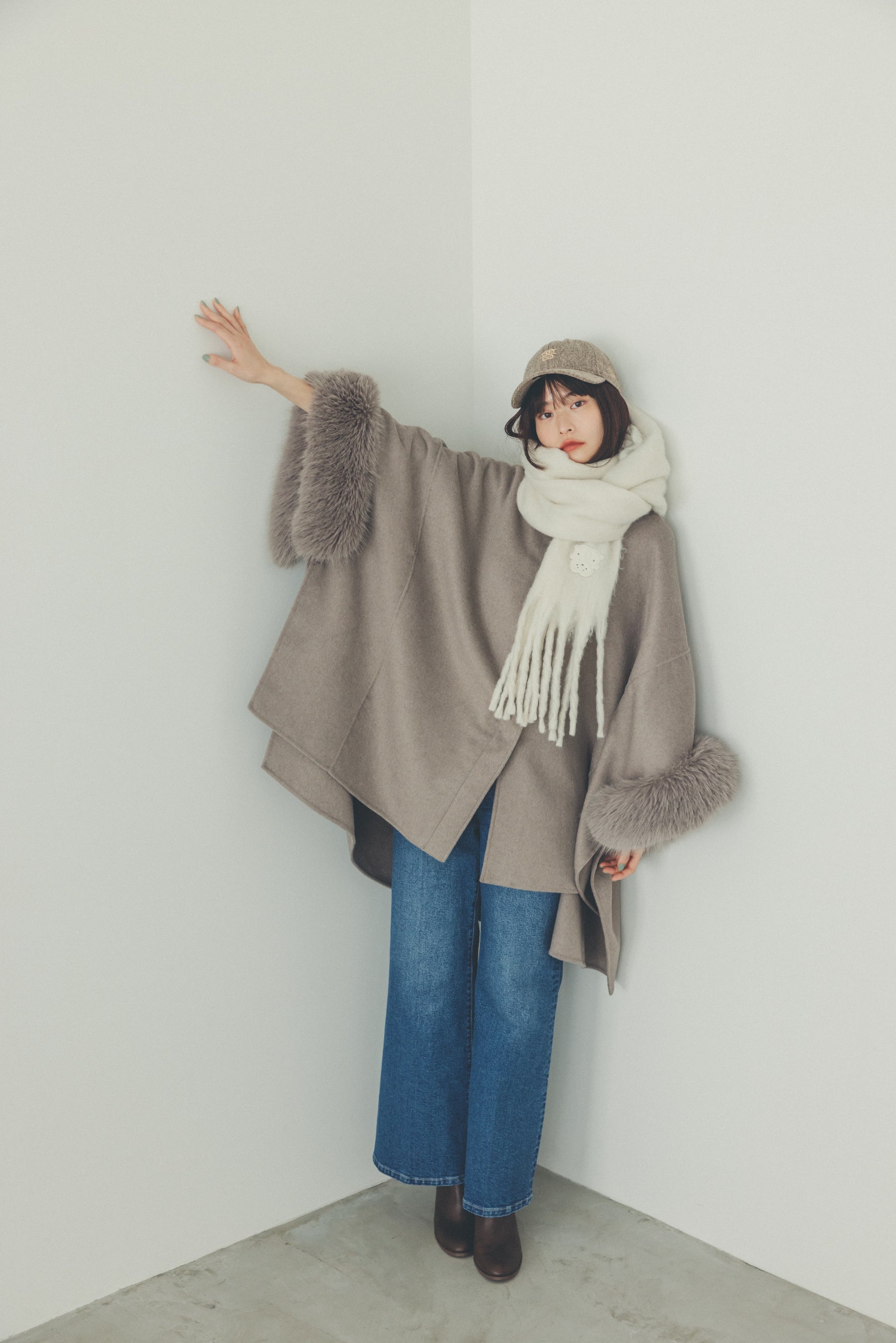 衿と袖にあしらわれたボリューミーなエコファーが魅力的なケープコート。