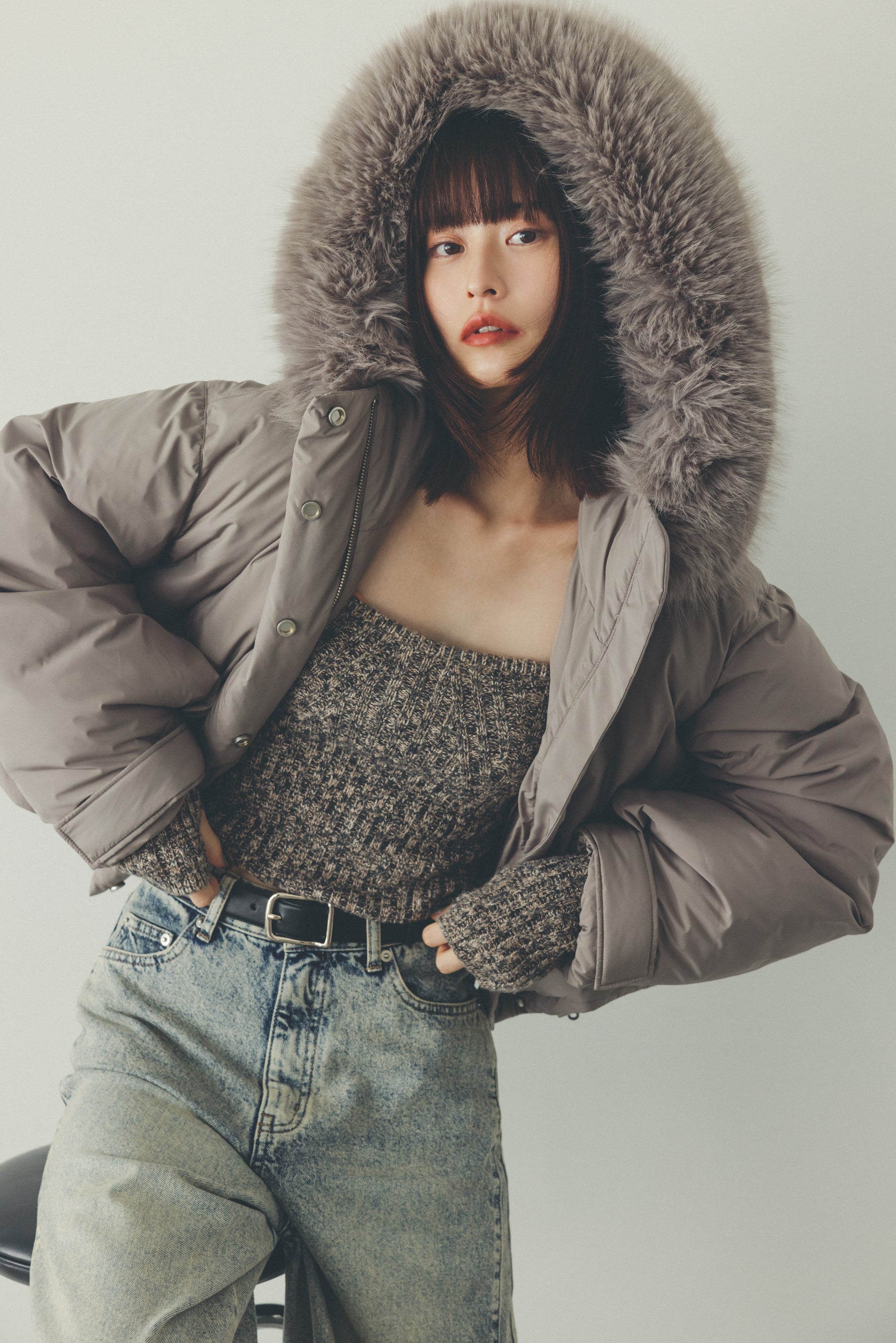 取り外し可能なボリュームのあるエコファーは、着こなしをドラマティックに仕上げてくれます。