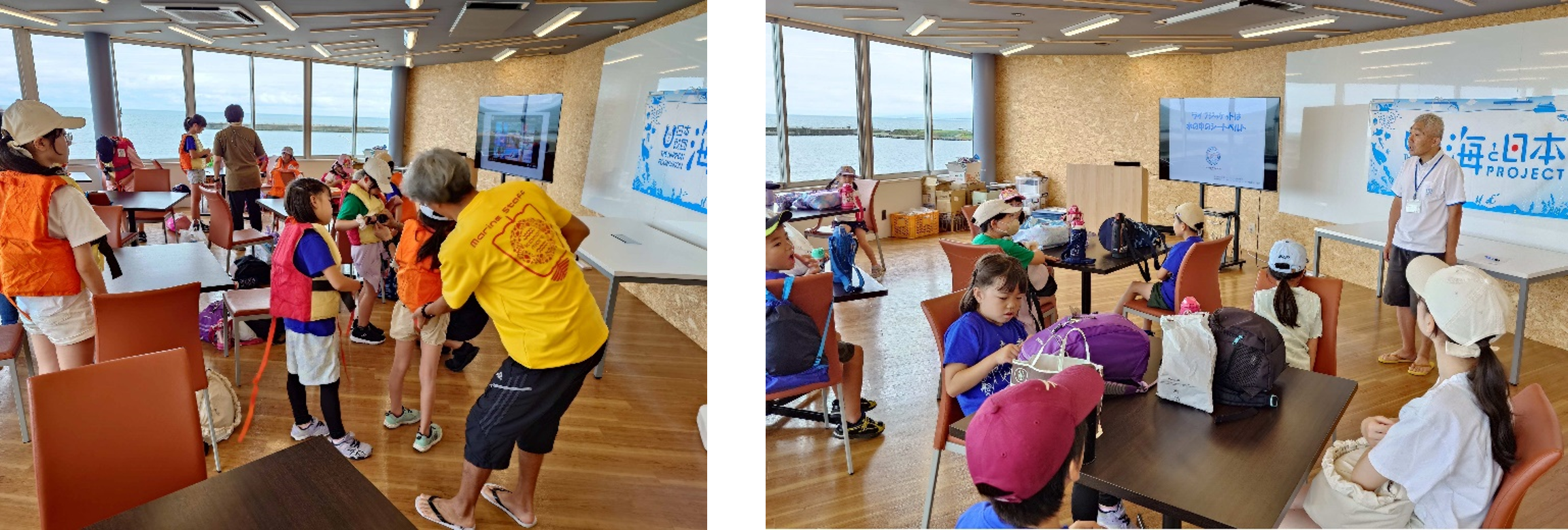 ビデオ映像を用いて海の危険、川の危険等を説明し、どうしたら水難事故を防げるのか?等の講習を実施しました。講師のライフセーバーからはライフジャケットの重要性、着用方法をレクチャーいただきました。