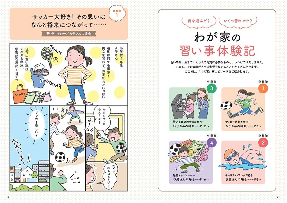 ●4家族の習い事実録体験マンガ: サッカー大好き女子の情熱、中学受験との葛藤、先生との相性、過密スケジュールによる疲弊など、親子の本音と成長を描いています 。