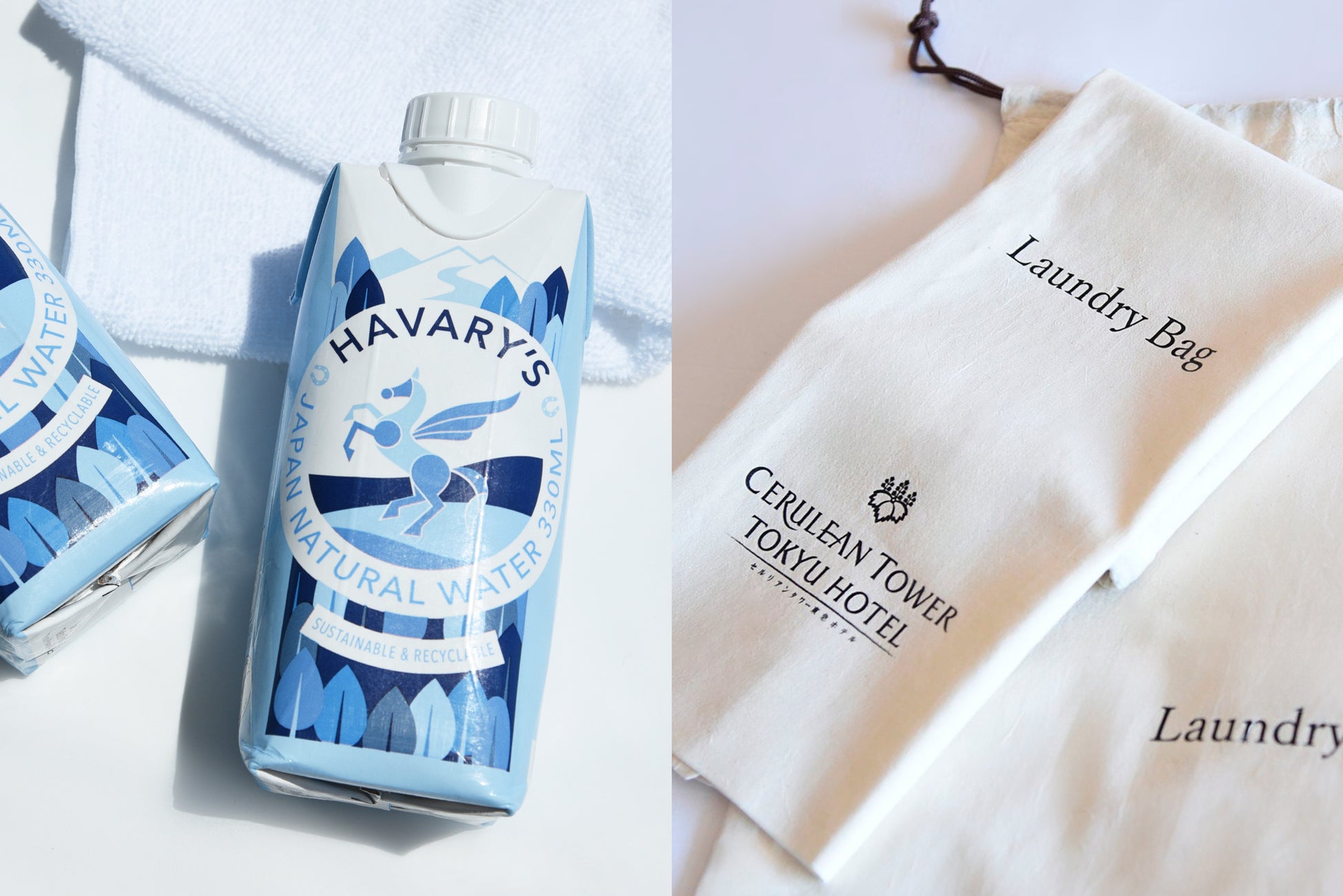紙パックナチュラルウォーターや、布製ランドリーバッグを新たに採用