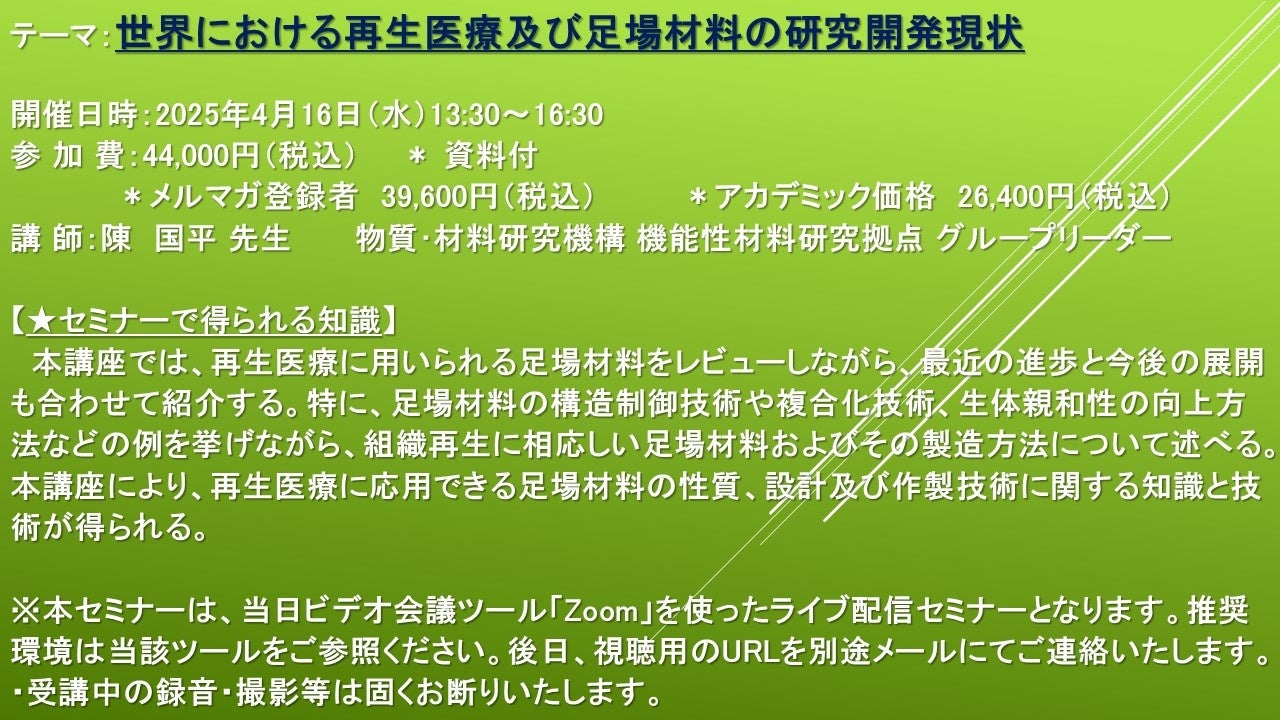 先端技術情報や市場情報を提供している(株)シーエムシー・リサーチ(千代田区神田錦町: https://cmcre.com/ )では、 各種材料・化学品などの市場動向・技術動向のセミナーや書籍発行を行っておりますが、 このたび「世界における再生医療及び足場材料の研究開発現状」と題するセミナーを、 講師に陳 国平 先生(物質・材料研究機構 機能性材料研究拠点 グループリーダー)をお迎えし、2025年4月16日(水)13:30より、 ZOOMを利用したライブ配信で開催いたします。 受講料は、 一般:44,000円(税込)、 弊社メルマガ会員:39,600円(税込)、 アカデミック価格は26,400円(税込)となっております(資料付)。