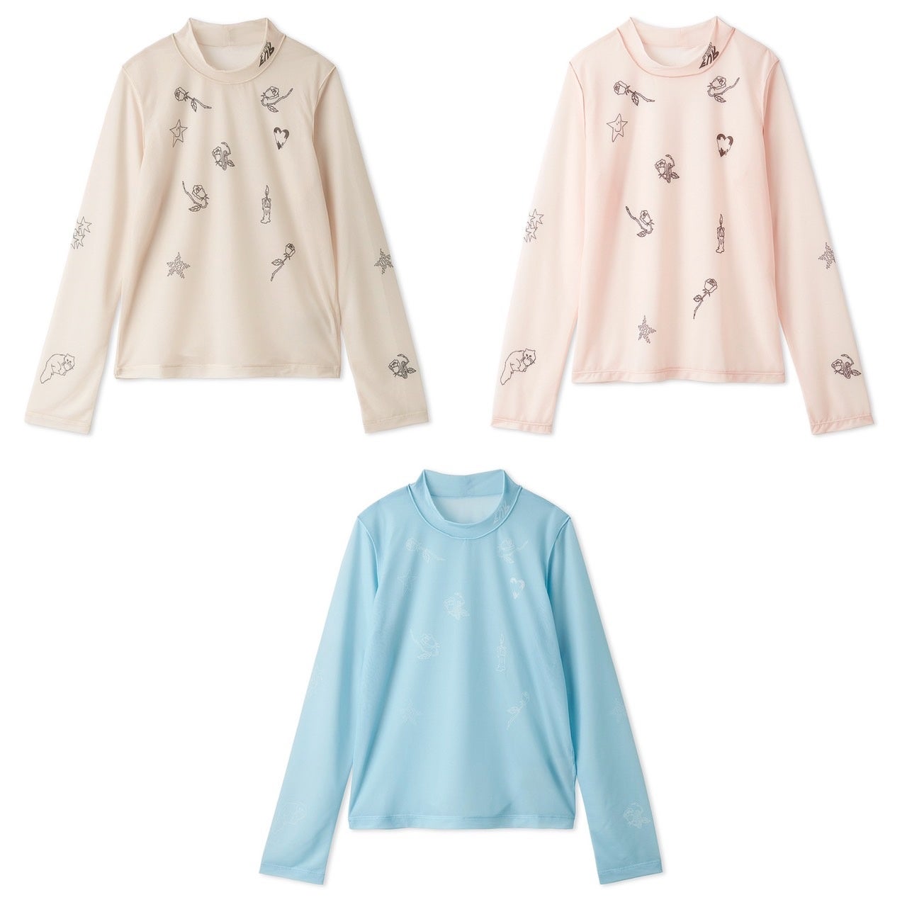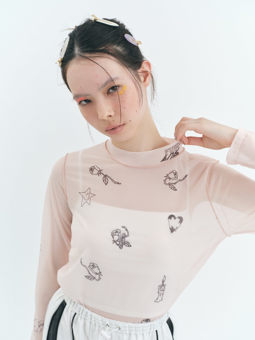 シアー素材にタトゥーモチーフを散りばめてプリントしたスキンプルオーバー。