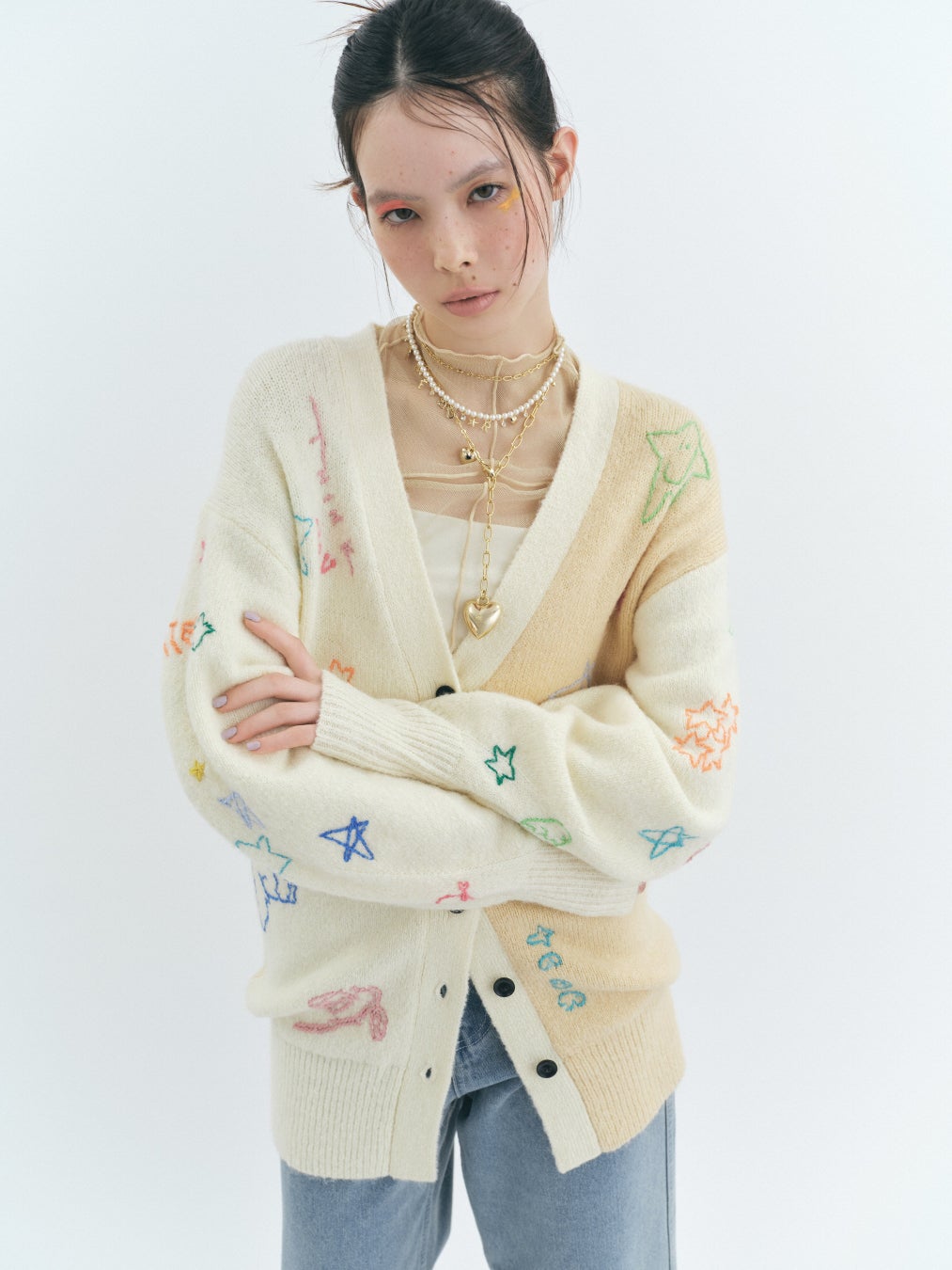 毎年好評のハンドステッチ刺繍のカーディガンにTAPPEI氏のカラフルなアートを落とし込み、ボディをワントーンのバイカラーにしてアップデート。