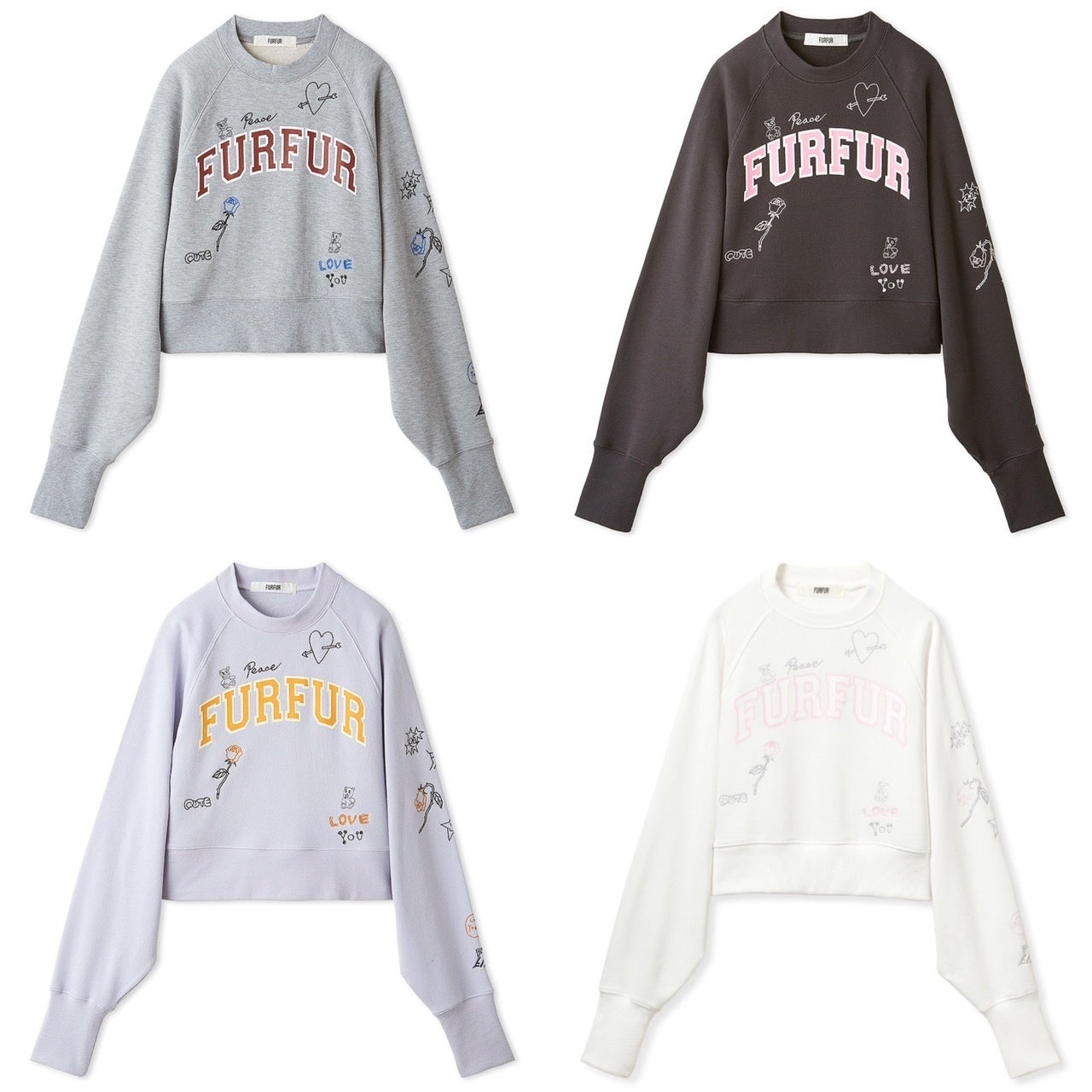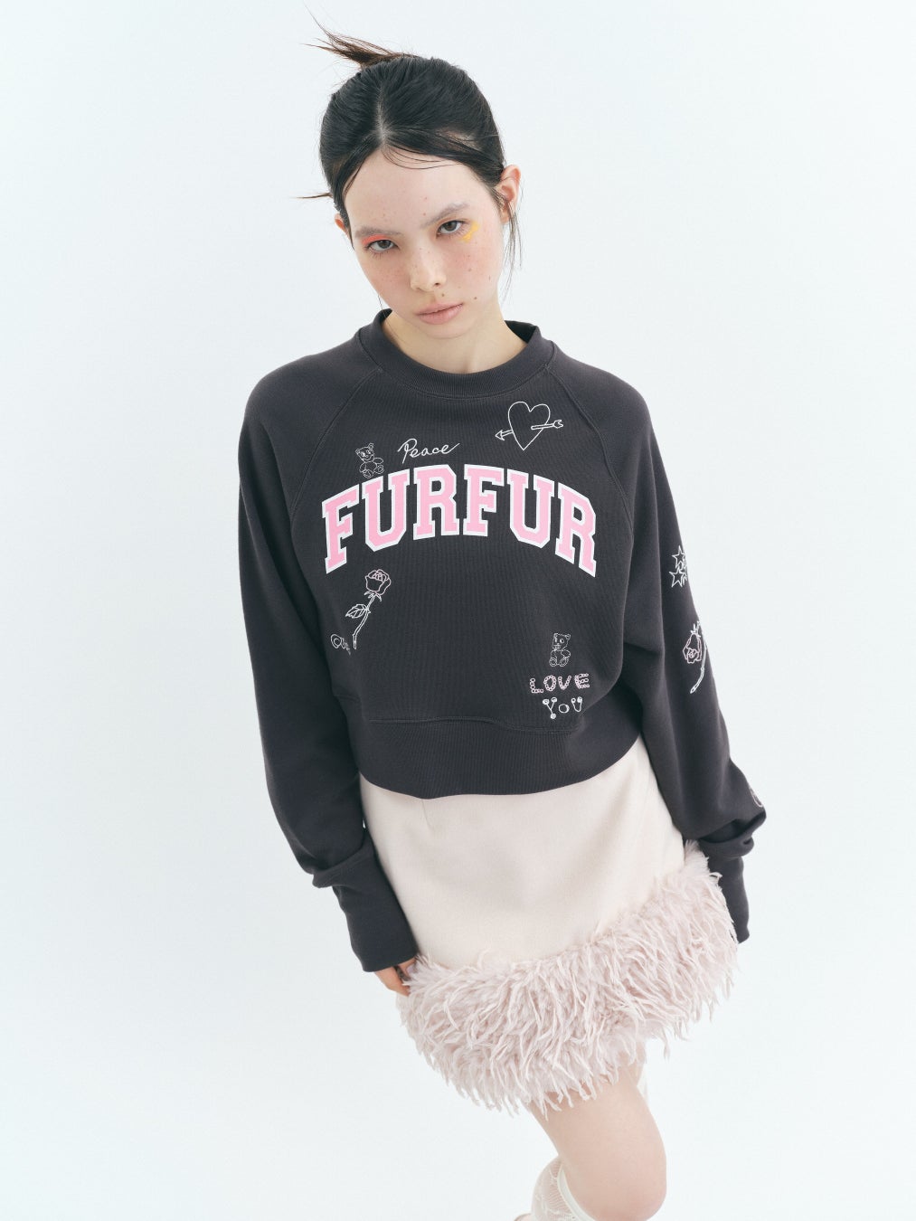 カレッジ風のFURFURロゴを前面にプリントしたショート丈スウェットに、タトゥーモチーフを刺繍で表現。