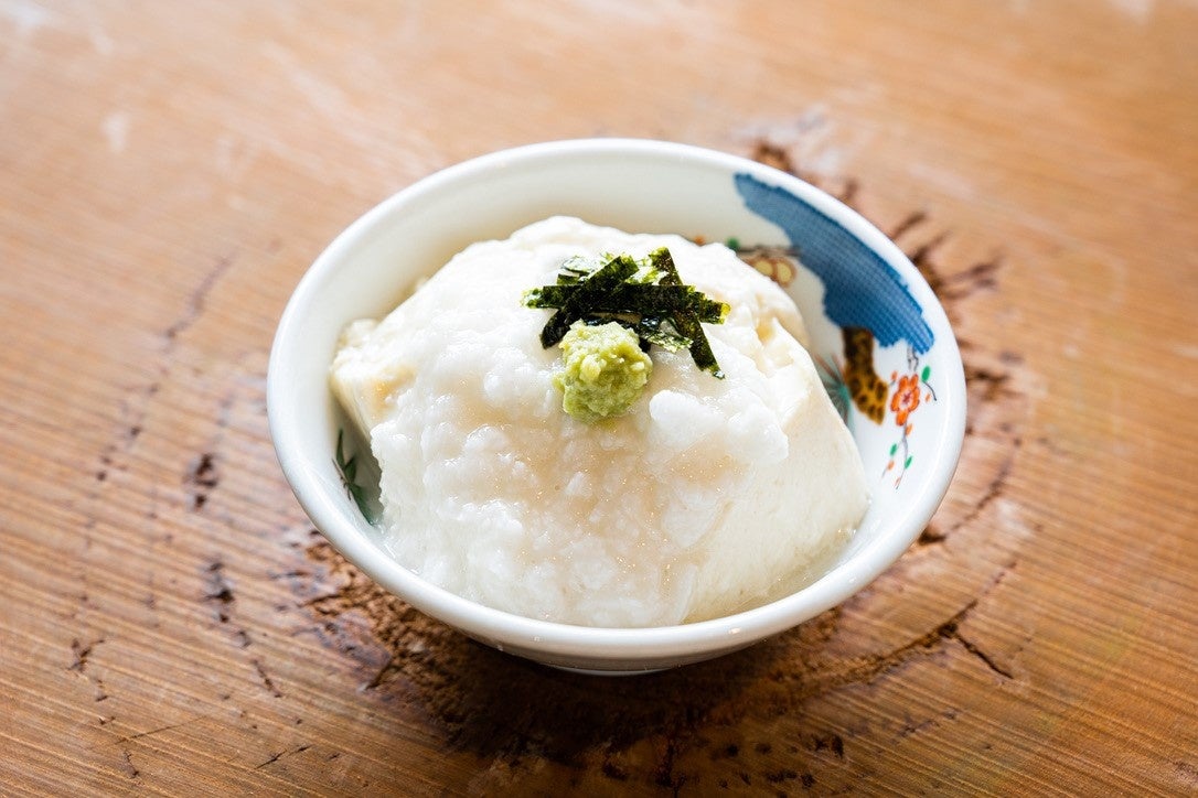 鬼おろしで荒めにおろした山芋を入れることで豆富とトロロの中間な食感になり口の中で溶けていく感覚になる豆富。