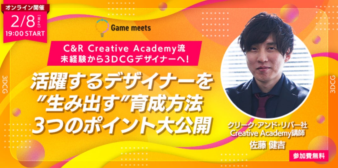 株式会社クリーク・アンド・リバー社(C&R社)が主催するクリエイティブ共創コミュニティー【Game meets】は2月8日(水)、無料のオンラインセミナー「~C&R Creative Academy流~ 未経験から3DCGデザイナーへ! 活躍するデザイナーを”生み出す”育成方法 3つのポイント大公開」を開催いたします。