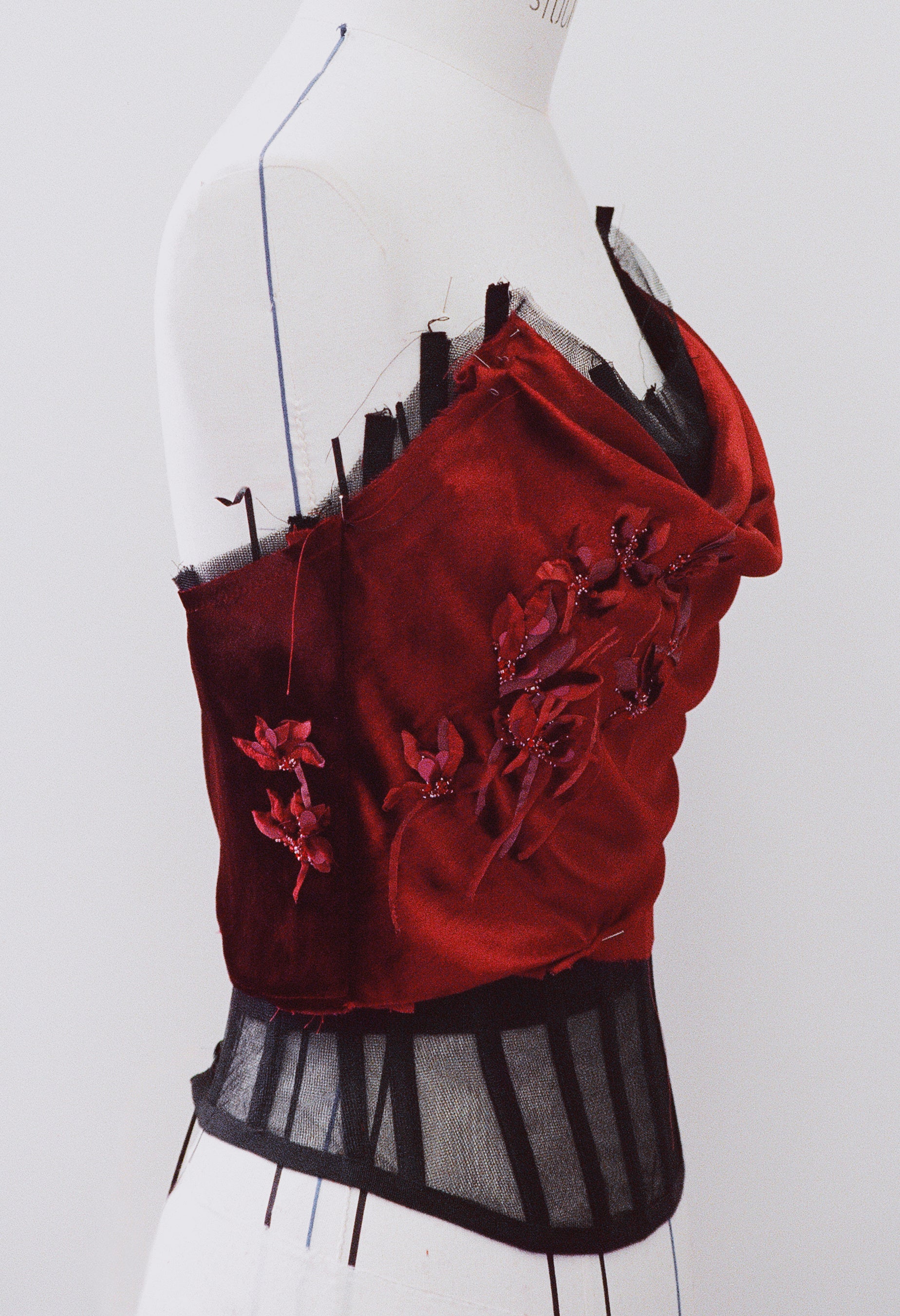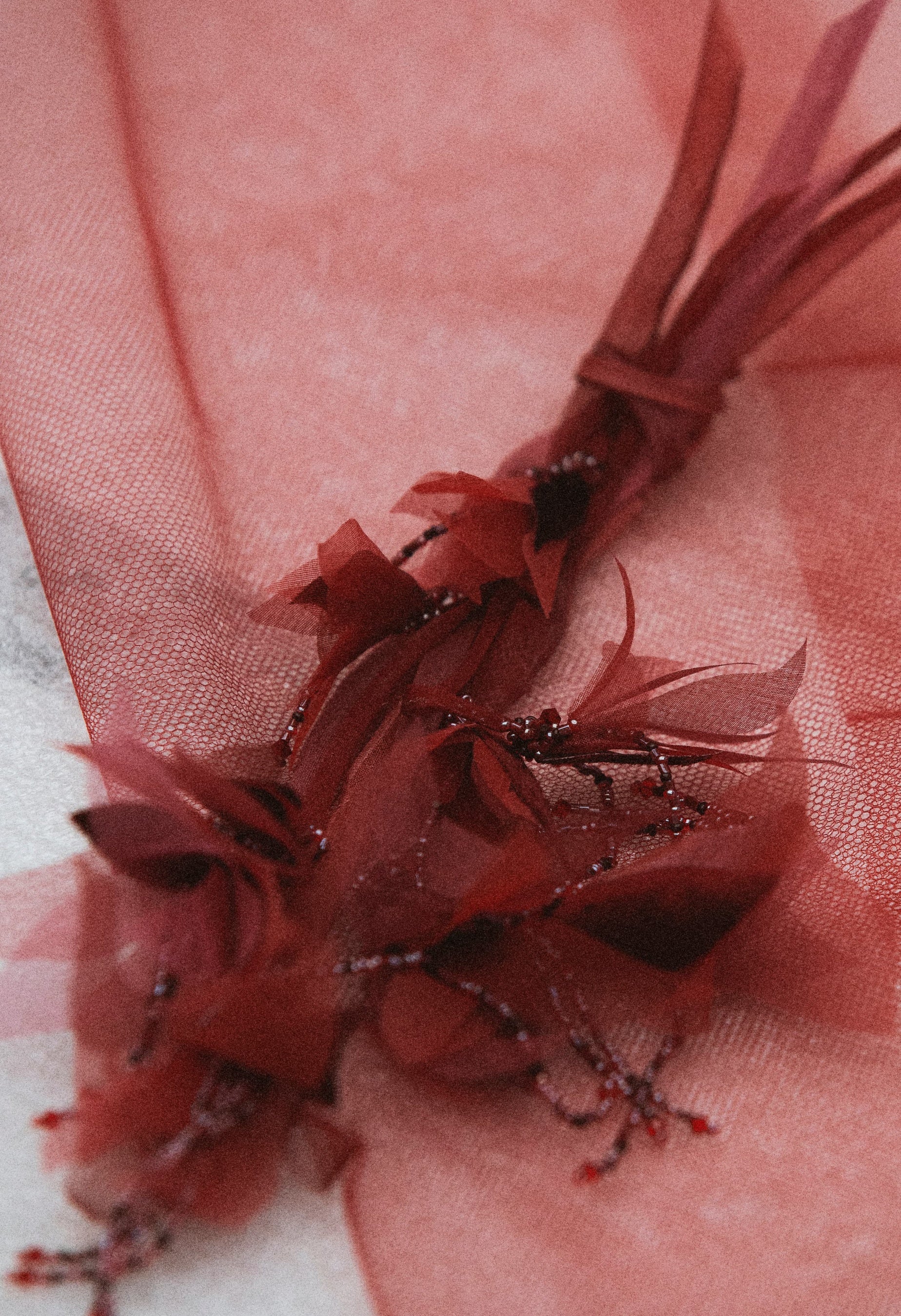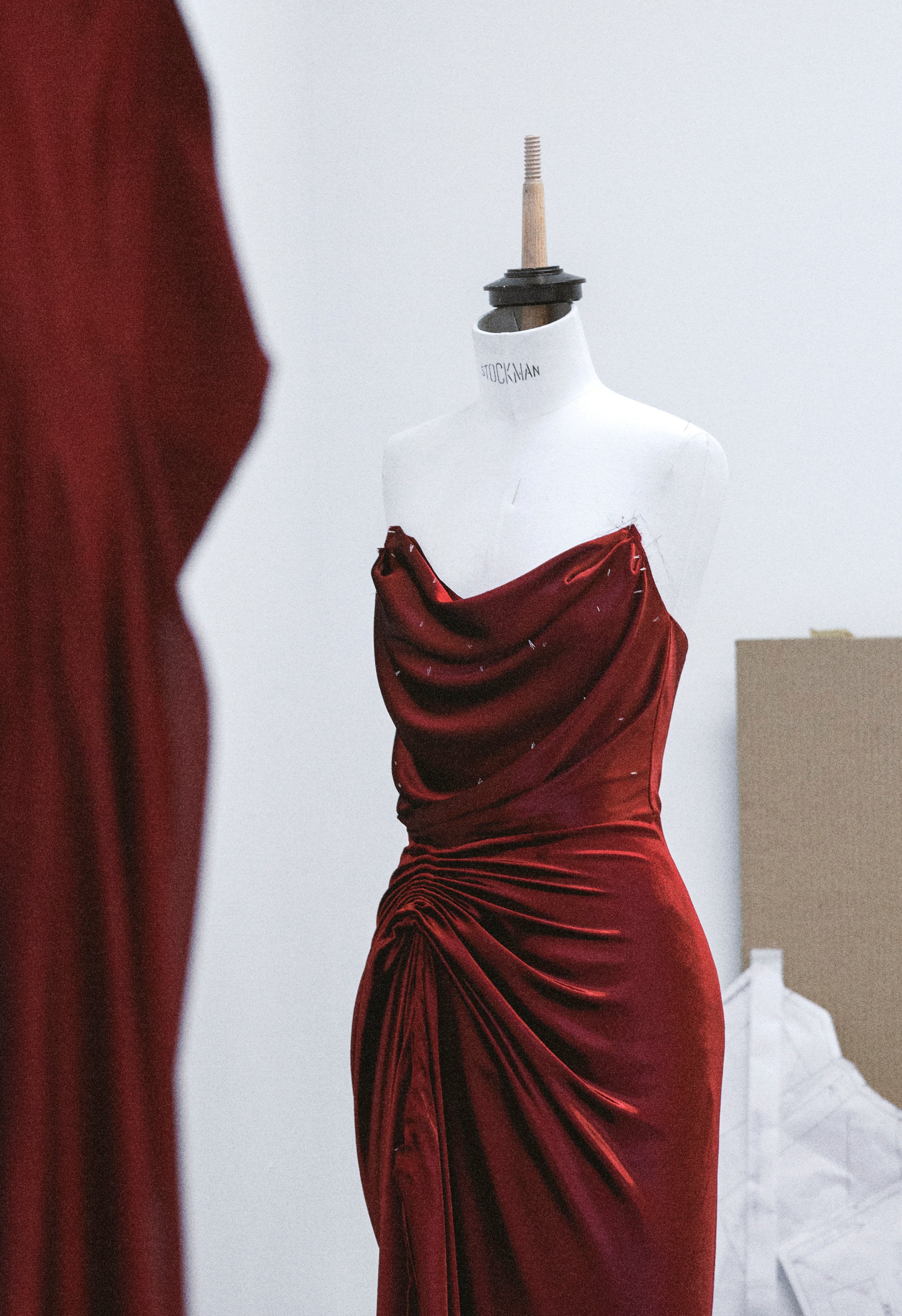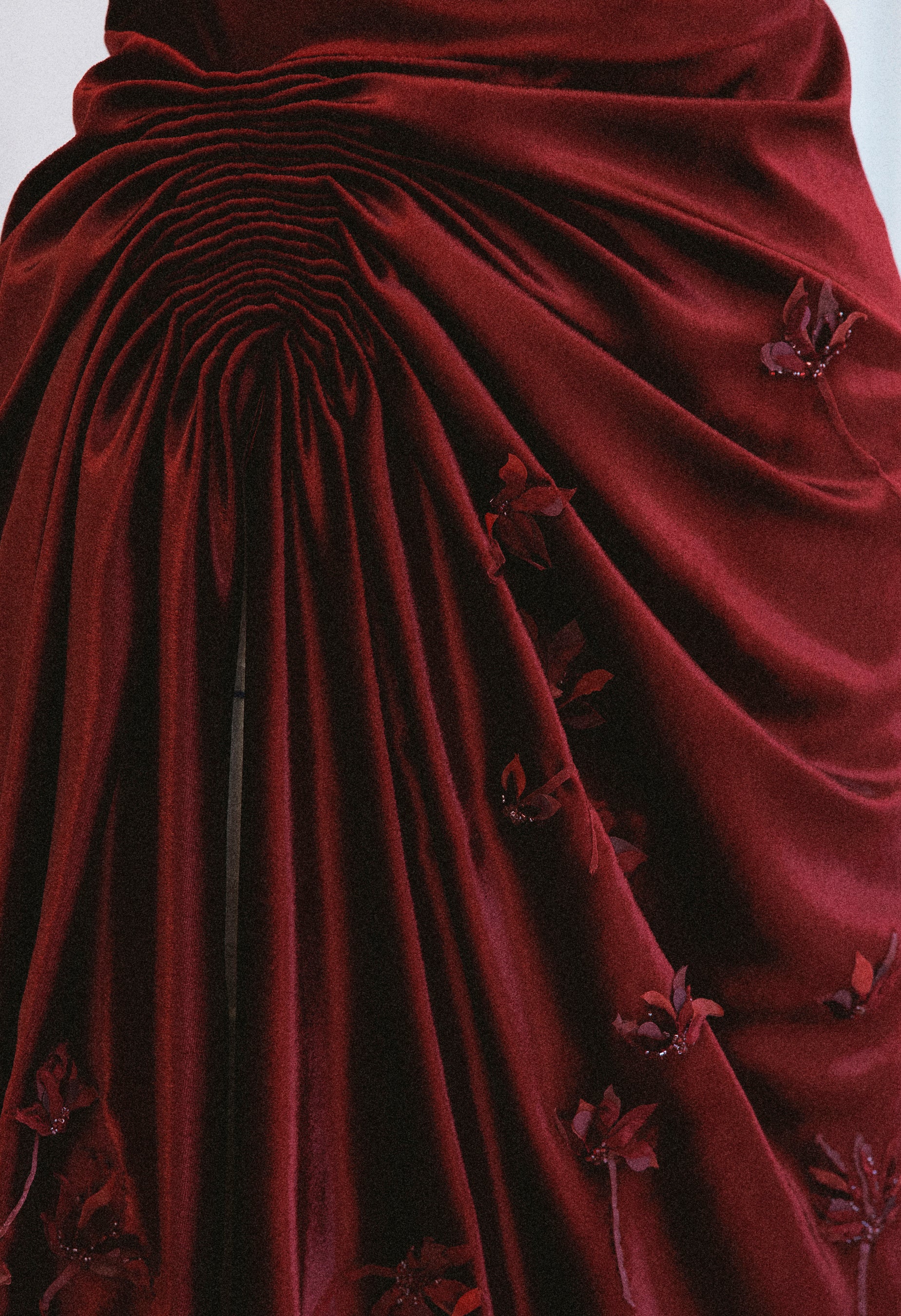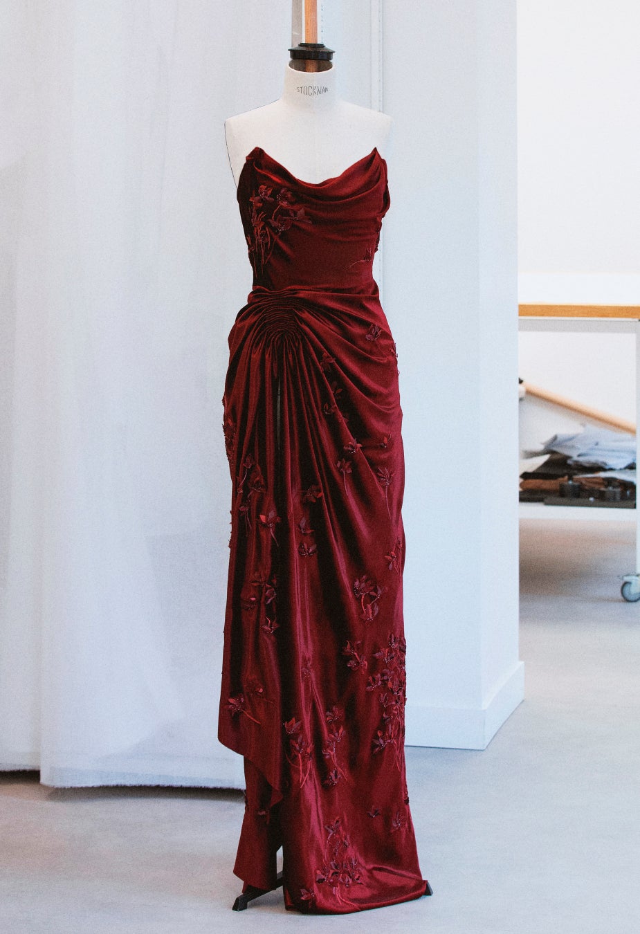 マイキー・マディソンは、花柄の刺繍が施されたレッドベルベットのストラップレスドレスを纏い登場しました。