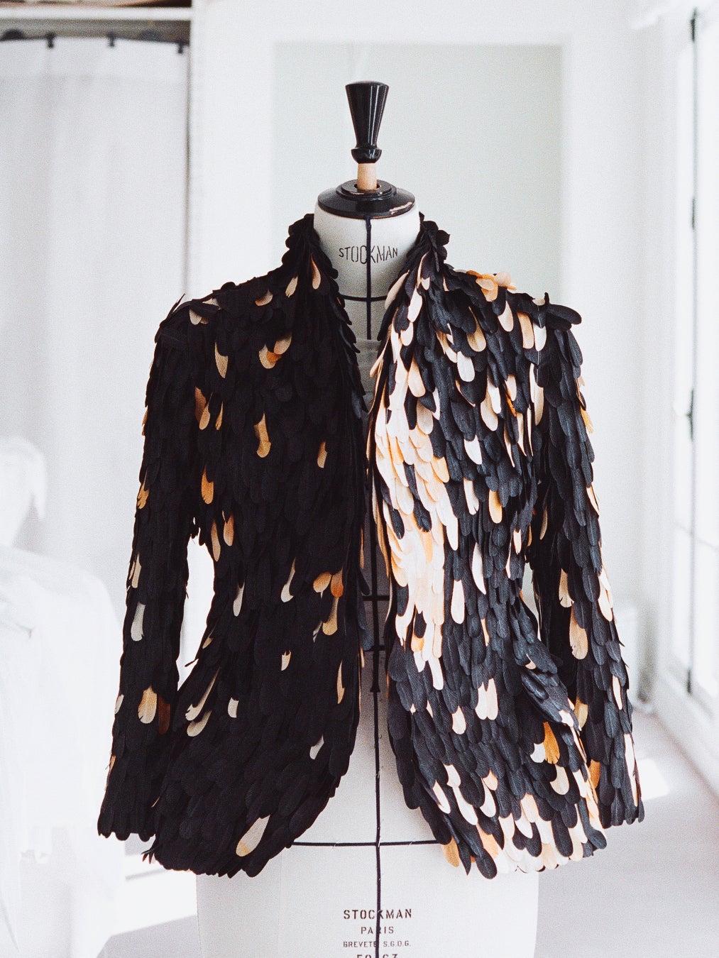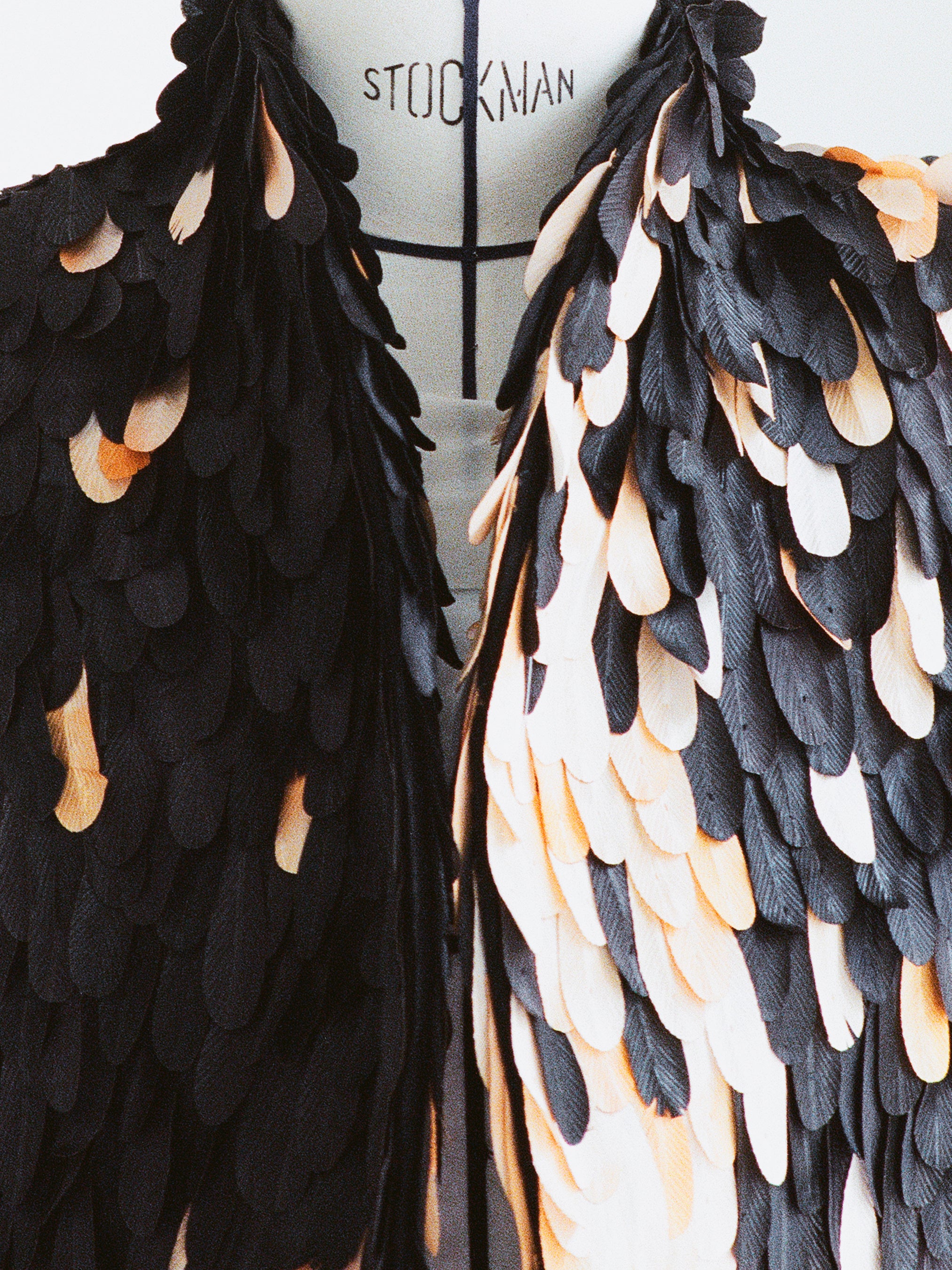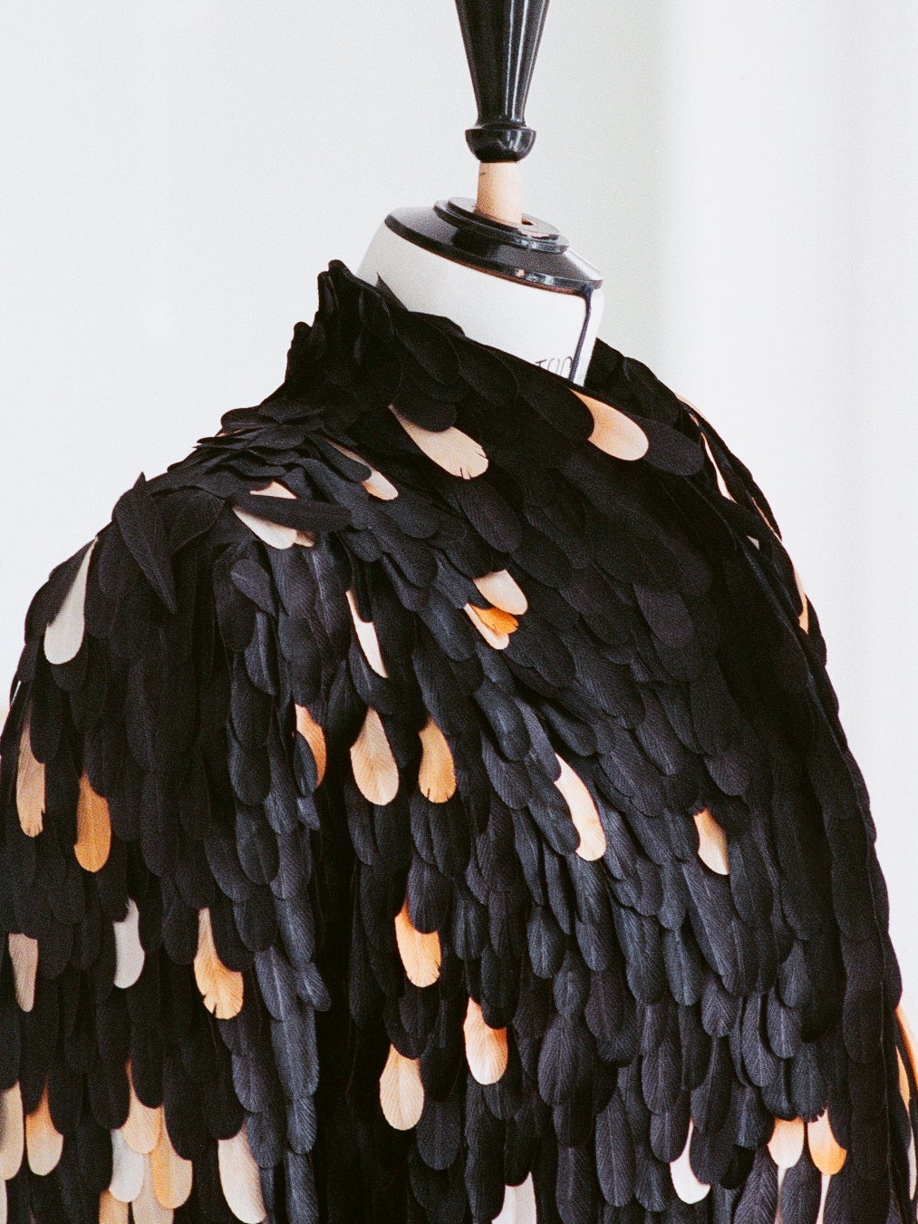 エイミー・マディガンは、ブラックのスパンコールの刺繍が施されたトップスに、シルクのフェザージャケットを羽織り、ウール&シルクのパンツを合わせました。