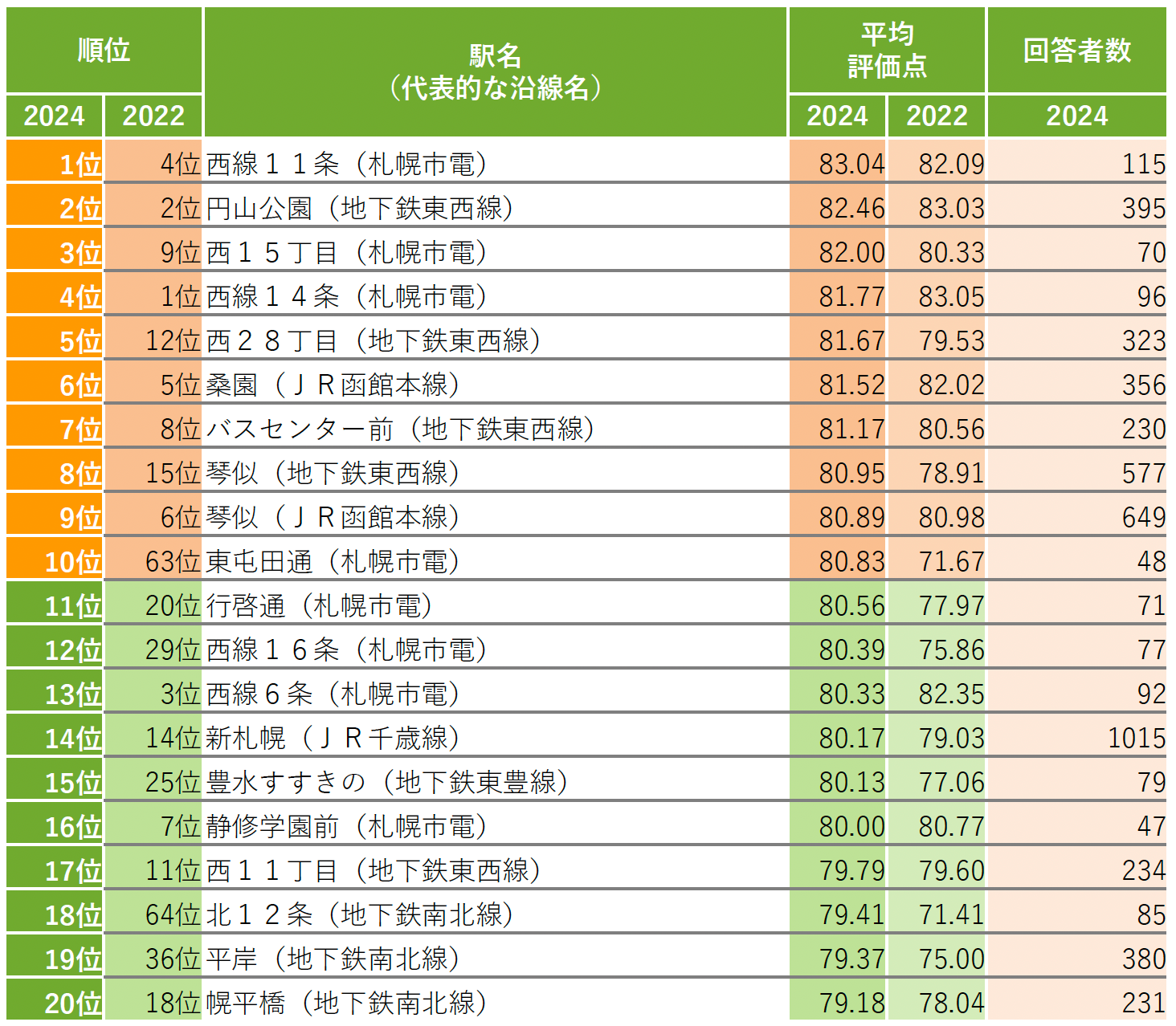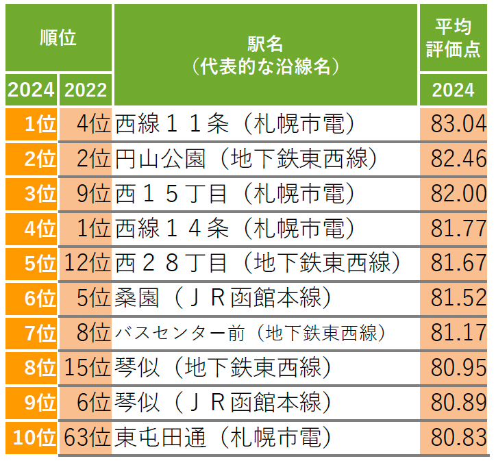 1位は「西線11条」で前回調査の4位から上昇。3位の「西15丁目」、4位の「西線14条」も札幌市電山鼻西線の駅だ。